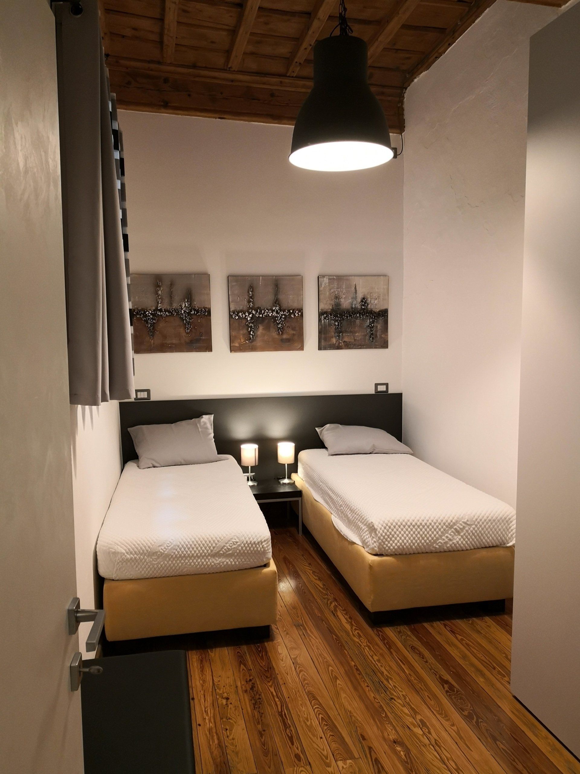 La camera da letto dall'atmosfera calda ed intima dispone di 2 letti singoli (con contenitore) facilmente unibili in matrimoniale. Il pavimento è originale della metà dell'800 in larice rosso, recuperato a nuovo.