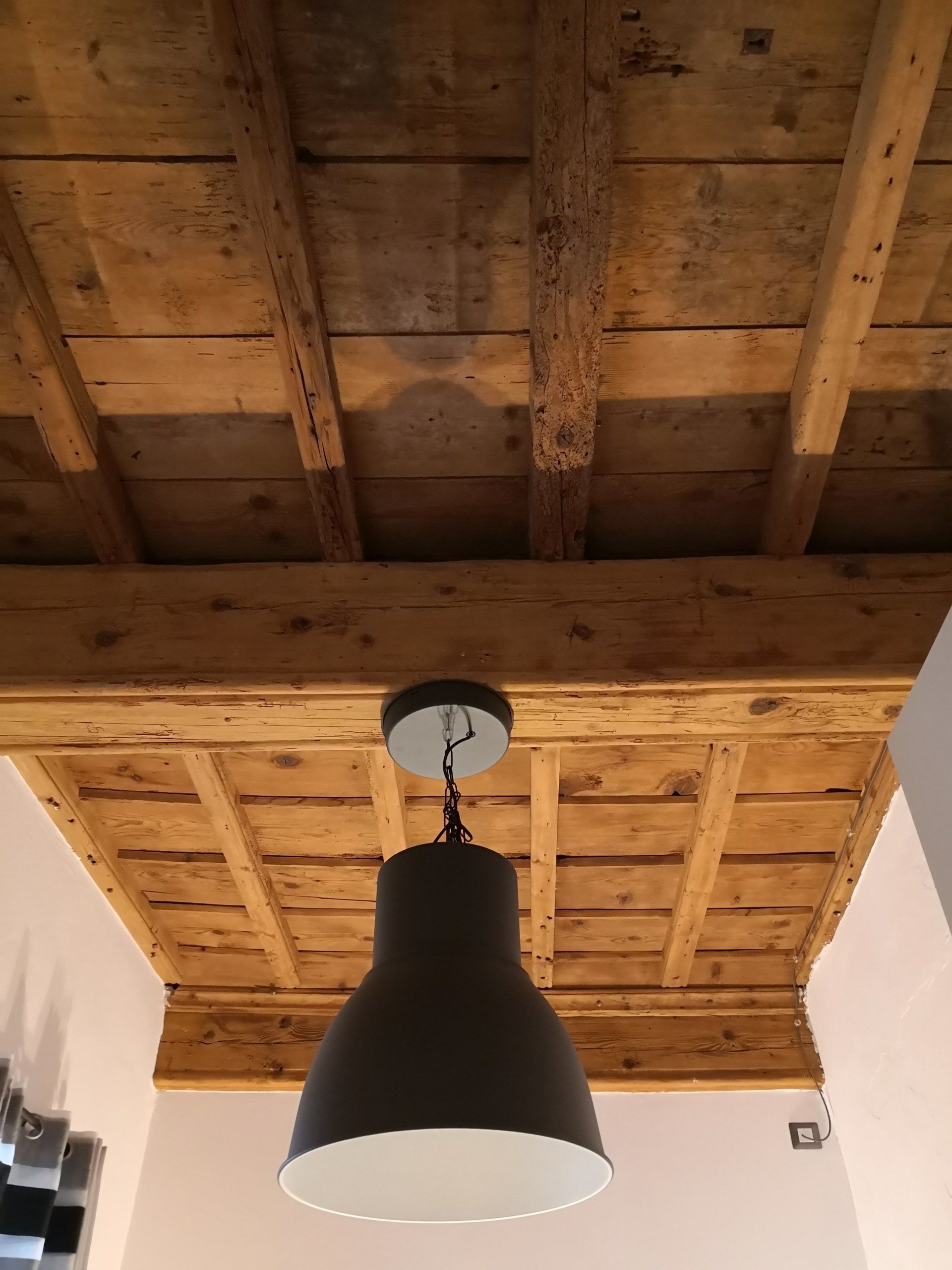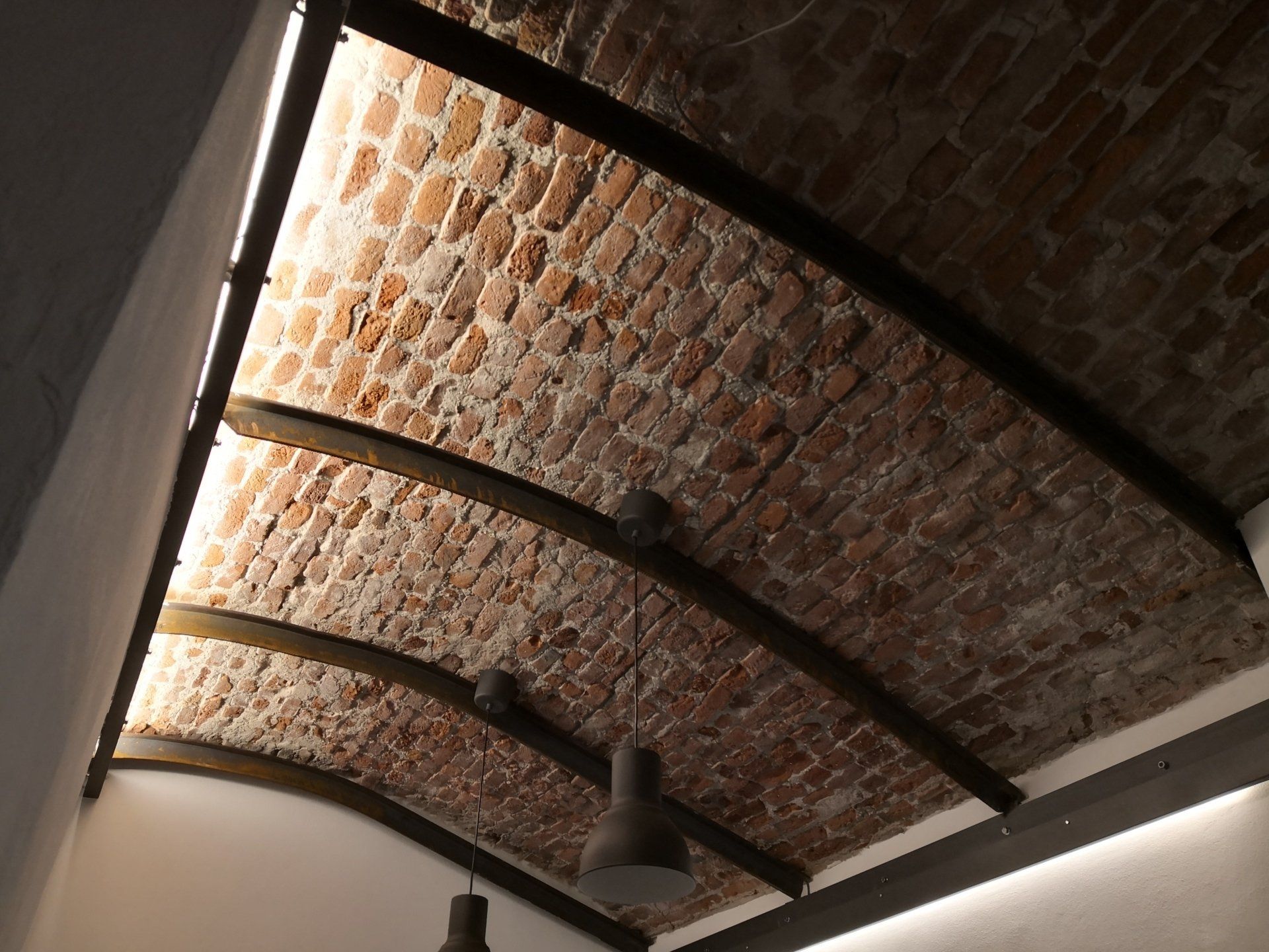 Il soffitto a volta è stato riportato al mattone grezzo e l'illuminazione a led nascosta dalle travi in acciaio creano una bellissima atmosfera. Inoltre 3 lampade a sospensione antracite.