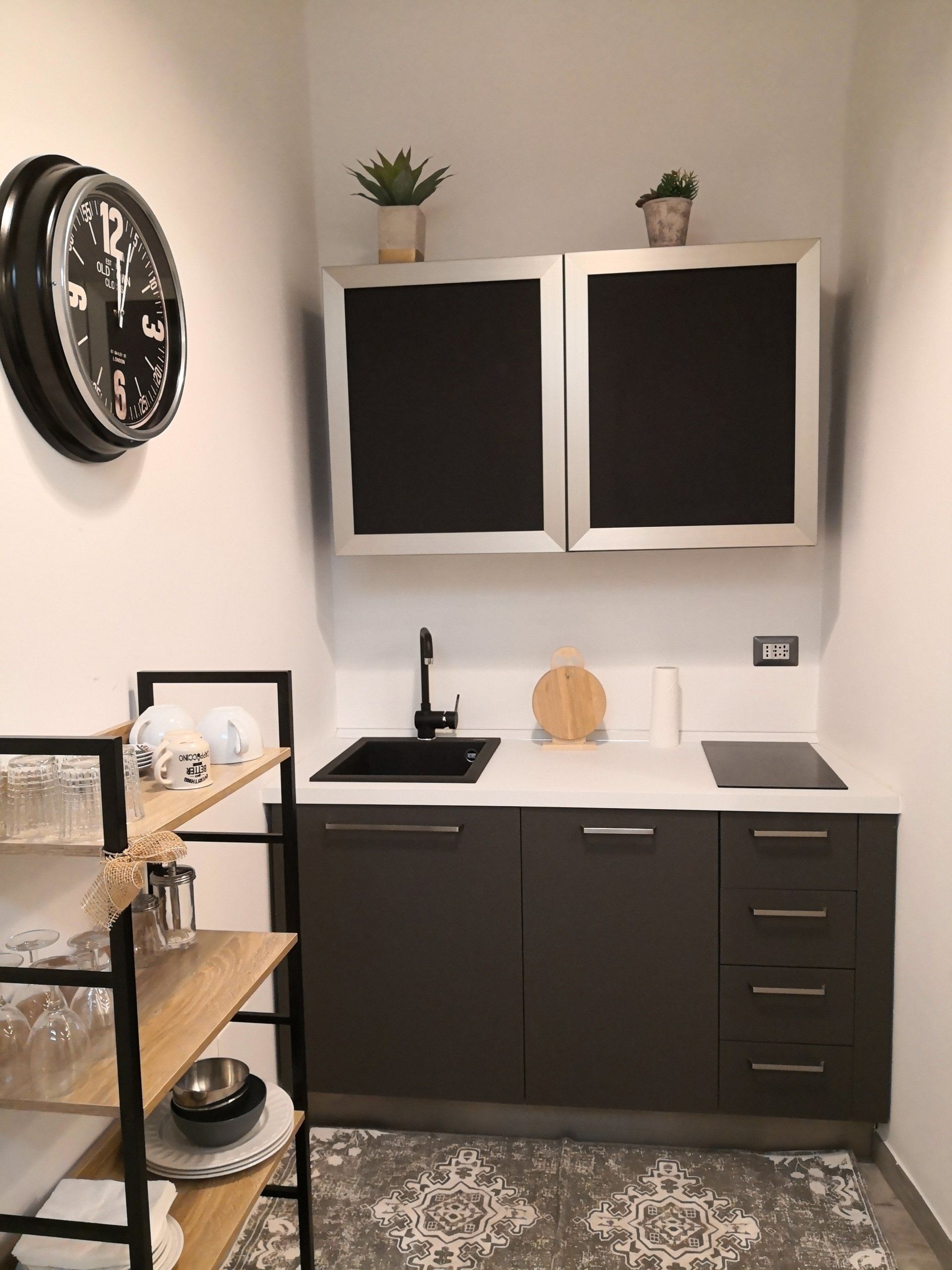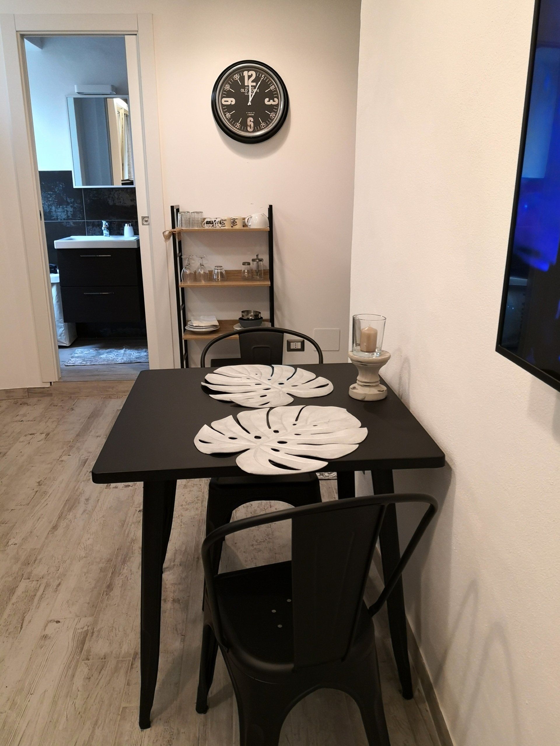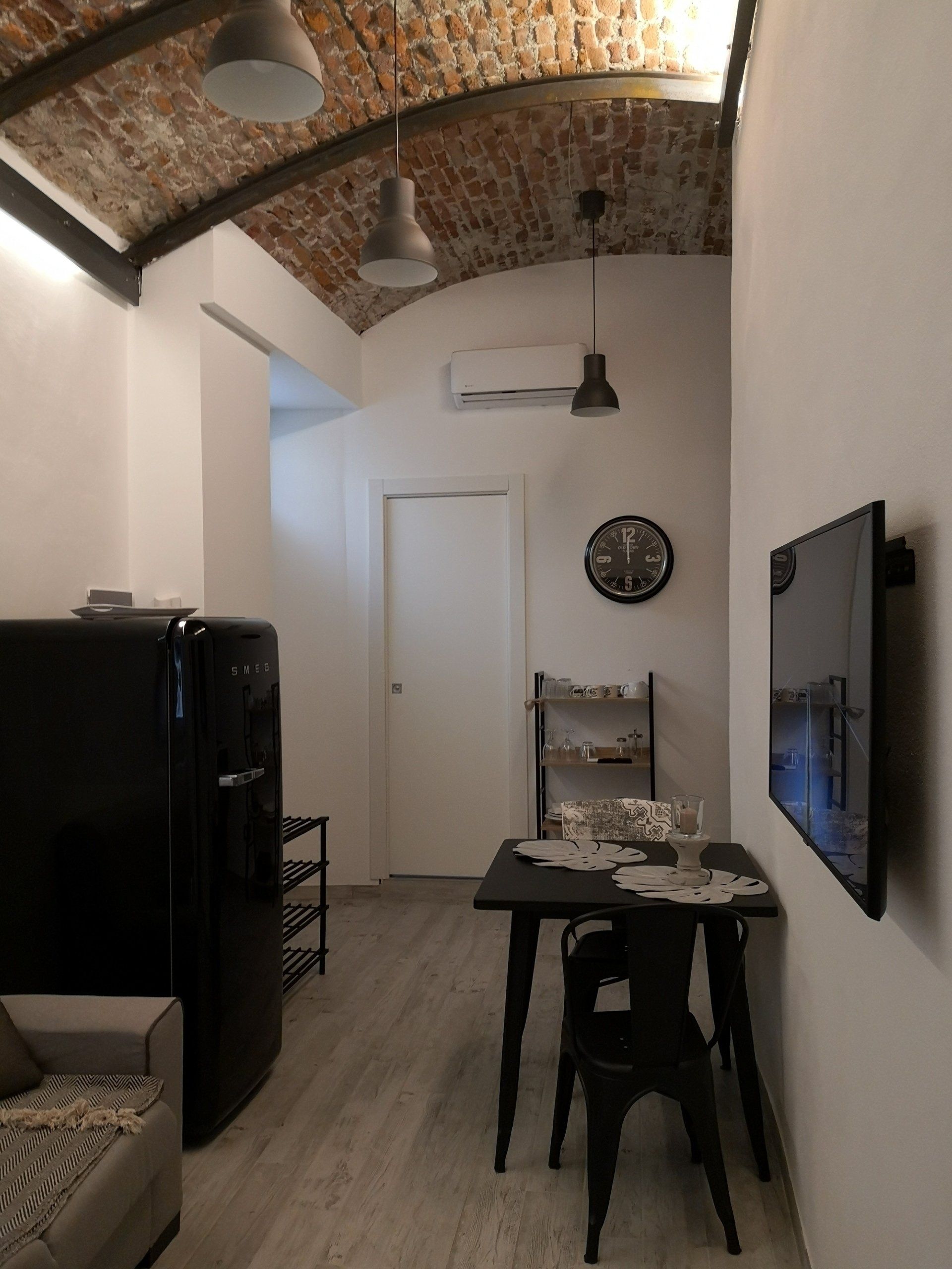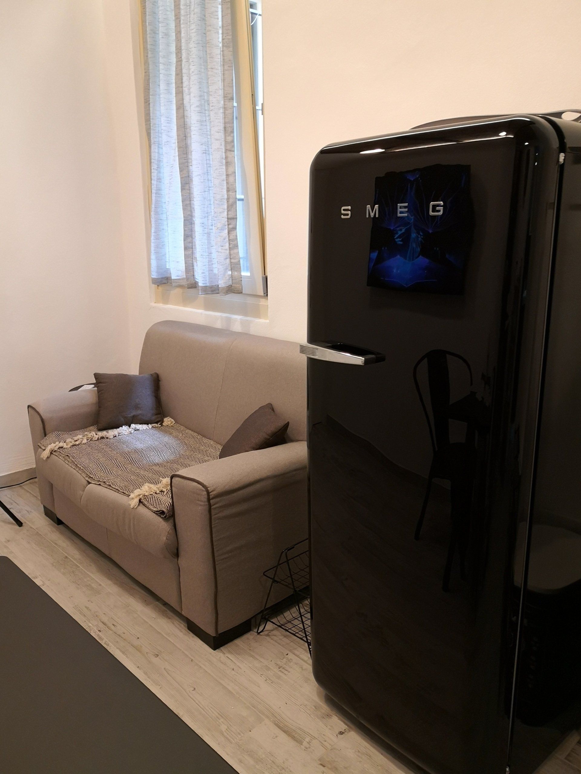 La suddivisione ha sfruttato al massimo gli spazi disponibili da ottenere una zona living modern industrial con cucina di forte design, completamente attrezzata e dotata di piano cottura ad induzione e lavastoviglie. Spicca il frigorifero SMEG stand-alone di colore nero. Un tavolo con sedie in metallo, comodo divano e TV lcd collegata ad internet completano la dotazione.