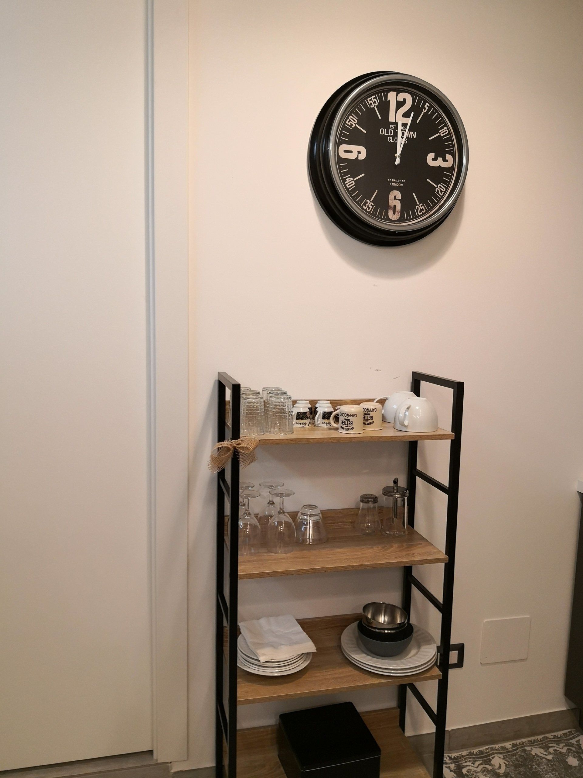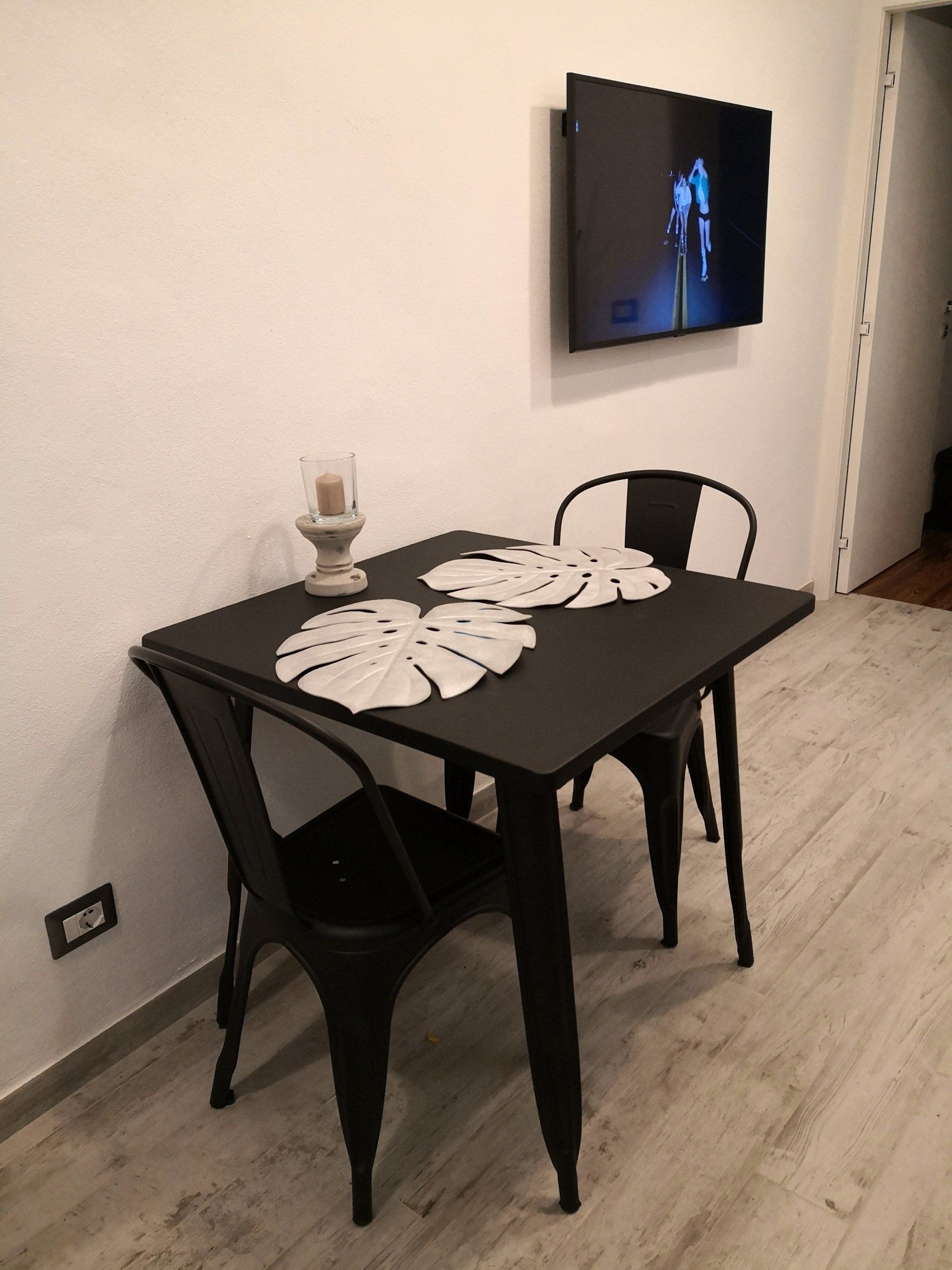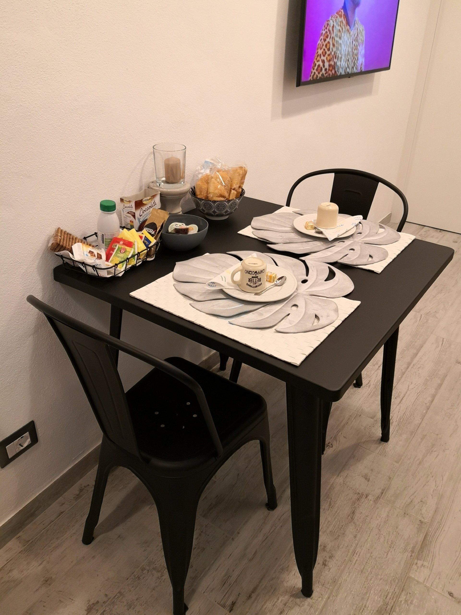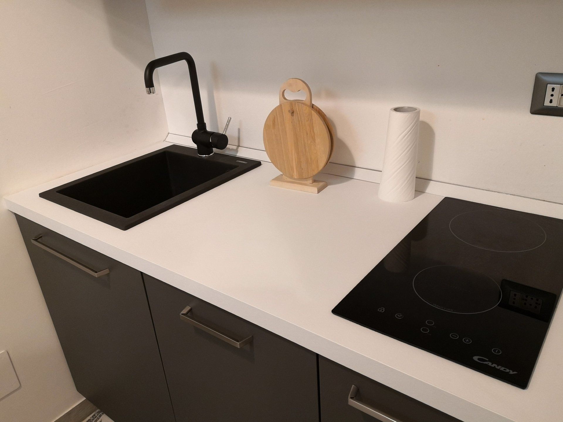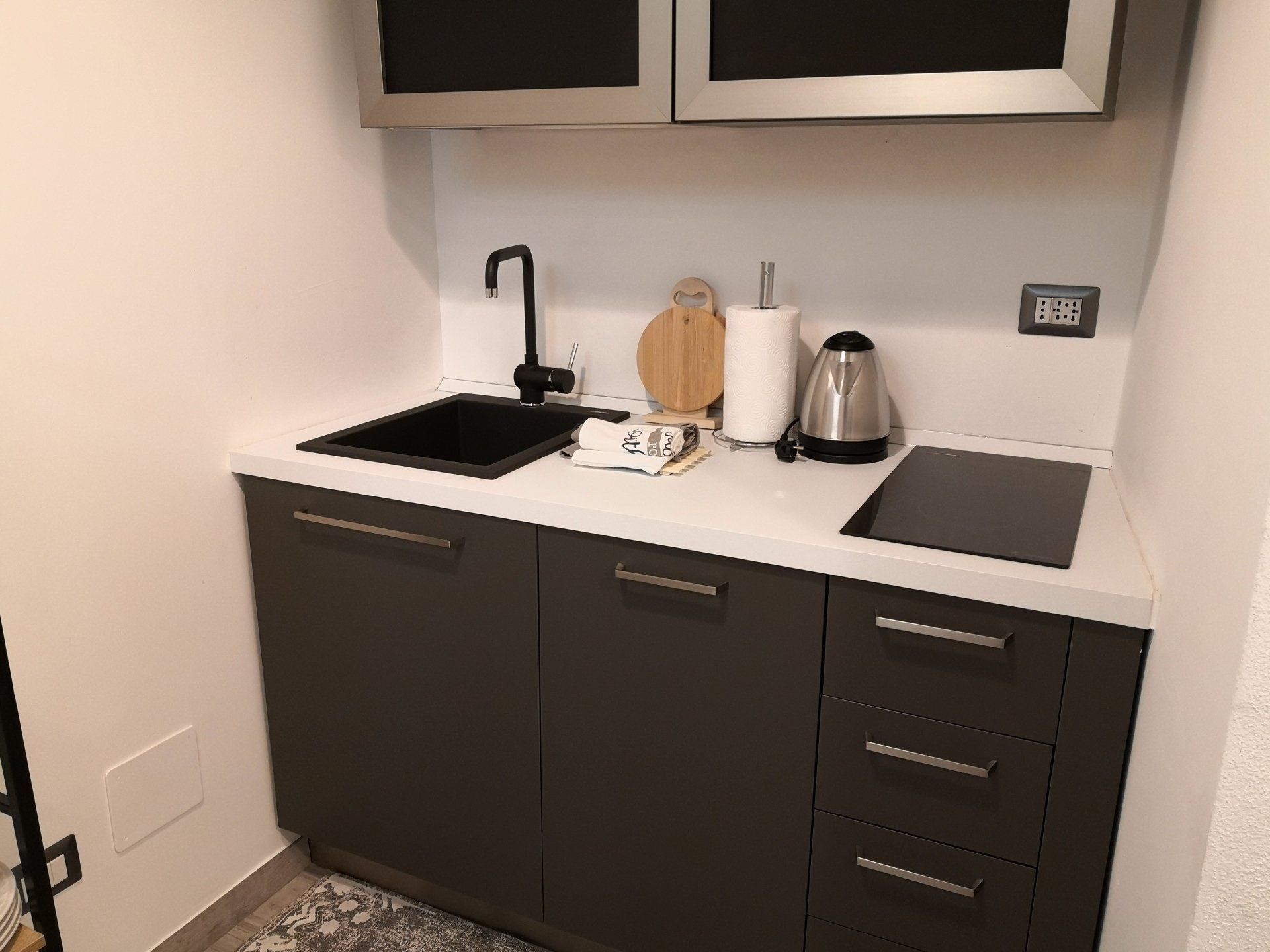 La suddivisione ha sfruttato al massimo gli spazi disponibili da ottenere una zona living modern industrial con cucina di forte design, completamente attrezzata e dotata di piano cottura ad induzione e lavastoviglie. Spicca il frigorifero SMEG stand-alone di colore nero. Un tavolo con sedie in metallo, comodo divano e TV lcd collegata ad internet completano la dotazione.
