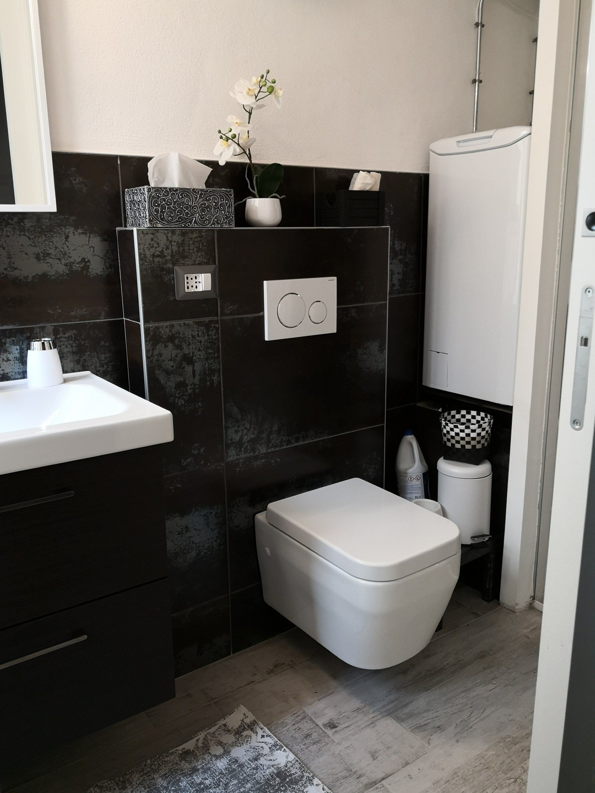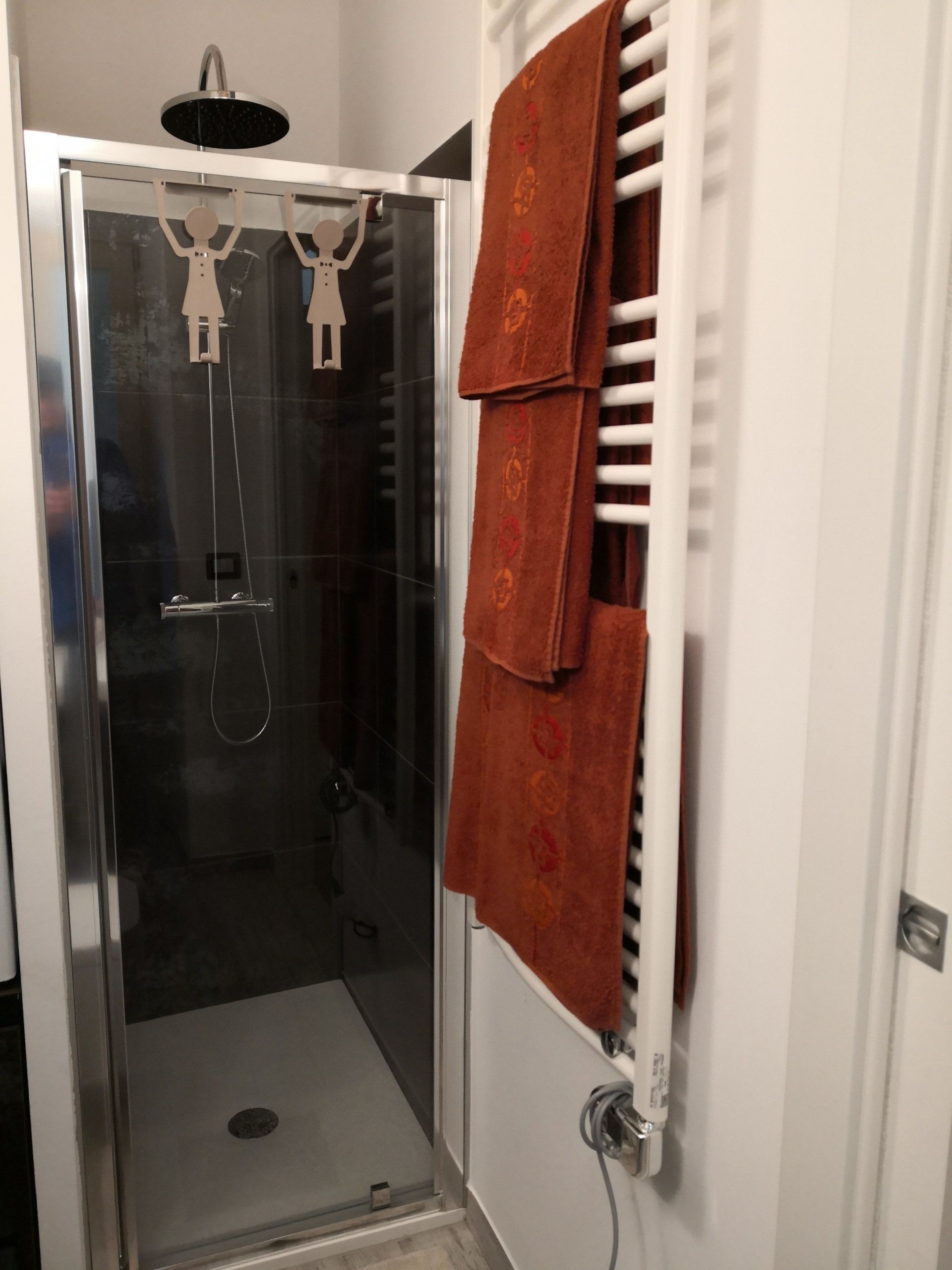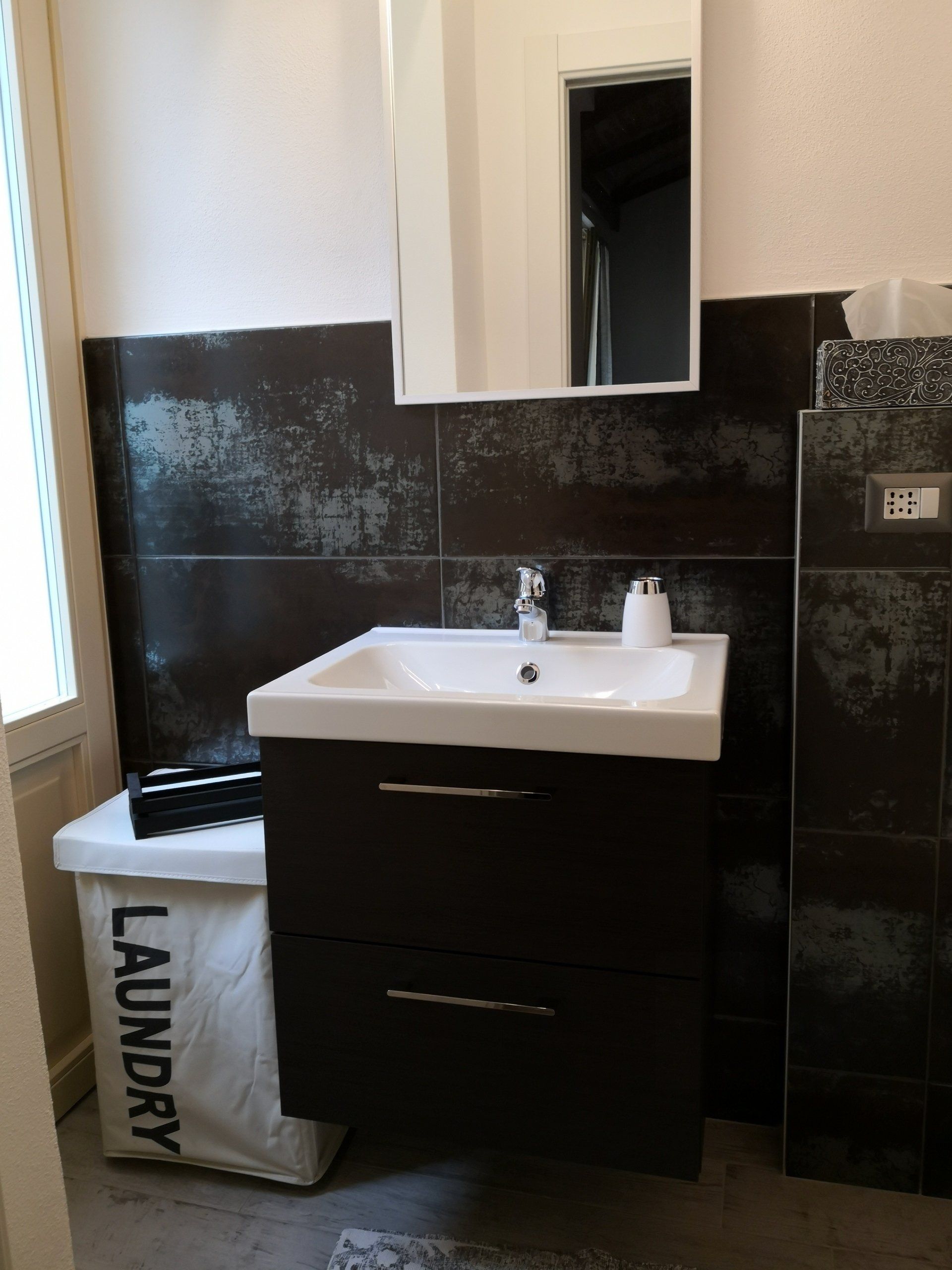 Il bagno è piccolo ma ben organizzato, con lavabo, wc e doccia in nicchia (70x100), con una bella porta finestra che dona aria e luce. In un'angolo trova posto una lavatrice.
