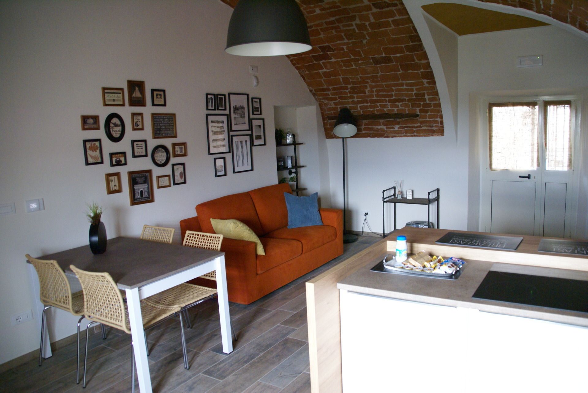 Loft in a magnificent frescoed dome from 1710. The apartment is the result of a restoration that has restored the octagonal hall of 60 square meters to its splendor. You will stay under the gaze of the God Apollo, his Muses and curious cherubs. In the one environment a comfortable sofa, a dining table, a bed with a wardrobe to breathe the air of the past. Imagine the story that these walls have seen in the past. Complete a kitchen, a bathroom recovered under the arched brick vaults. The building is known as Palazzo Rubatti di Torricella or Palazzo Tornaforte. Built in the mid-seventeenth century, the architect of the work is Francesco Gallo, author of over 80 buildings in southern Piedmont including the Sanctuary of Vicoforte "Magnificat". The original owners, the Rubatti, are an ancient decurional family of the Cuneo stalls, present in the list of 1535 with a noble chapel in San Francesco. The Count Carlo Massimiliano and his wife, the noble Violante Maria De Morri, daughter of the Counts De Morri of Castelmagno, live here. Subsequently the noble Barbara Violante Rubatti and her husband Marquis Della Valle Di Clavesana. And finally (just to name a few) the noble Paola Felicita Della Valle and her husband, the famous Count Saverio Bruno di Tornaforte, a heroic militia general. Here in 1809 Pope Pius VII visited the old Count of Tornefort during his journey, prisoner of Napoleon. In short, this show has seen 350 years of history, illustrious characters and magnificent parties. It is precisely the concert of the Muses, a theme chosen by the Rubatti to decorate the vault of the hall of honor, to suggest its use. In 1710 the Swiss painter Giovan Francesco Gaggini, who was working at the Church of the Holy Cross in Cuneo together with the Pozzi brothers, authors of the paintings, was called to perform the work. Clio, Euterpe, Thalia, Melpomene, Tersicore, Erato, Polimnia, Urania and Calliope, accompanied by a correspondence of putti, observe the God Apollo, isolated in the center of the composition, wrapped in a large drapery, crowned with laurel, while with one hand greets and with the other holds the lyre. The scene announces the beginning of an imminent concert: the muses and the putti are ready to play and sing, the instruments tuned, the scores open, while Apollo, conductor of the orchestra, with the gesture of the arm will give the start. The scene is set in the sky, between vaporous white-blue-yellowish-pink clouds. A rich shaped balustrade surrounds the opening towards the sky, highlighting the illusory breaking of the ceiling, while the scenographic painted architectural structure continues below with ample volutes, fake marbles and oval windows, vases full of fruits, garlands, festoons and branches foliaceous. In the living room you can see an original painting restored (oil on canvas) of the heraldic coat of arms of the Rubatti-De Morri alliance. The occasion is precisely the marriage that was celebrated in the Parish Church of Santa Maria del Bosco, Cathedral of Cuneo, on 3 February 1694, with the motto Tas Stil. The saloon was recovered and brought as much as possible to the original of the time. In the center, a fifth contains a walk-in closet and shelters the double bed. A sofa bed, a glass table with chairs and an open bookcase complete the deliberately minimalist furniture. In other spaces you will find a fully equipped kitchen with fridge, induction hob, dishwasher, "Nespresso" coffee machine. In a small storage room also a comfortable washing machine. Bathroom with shower, toilet and comfortable vertical heated towel rail. La Cupola is located on the third floor of the building, without a lift. The stairs are very large and accessible.