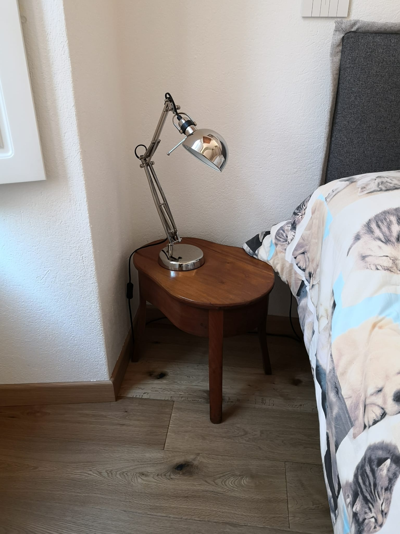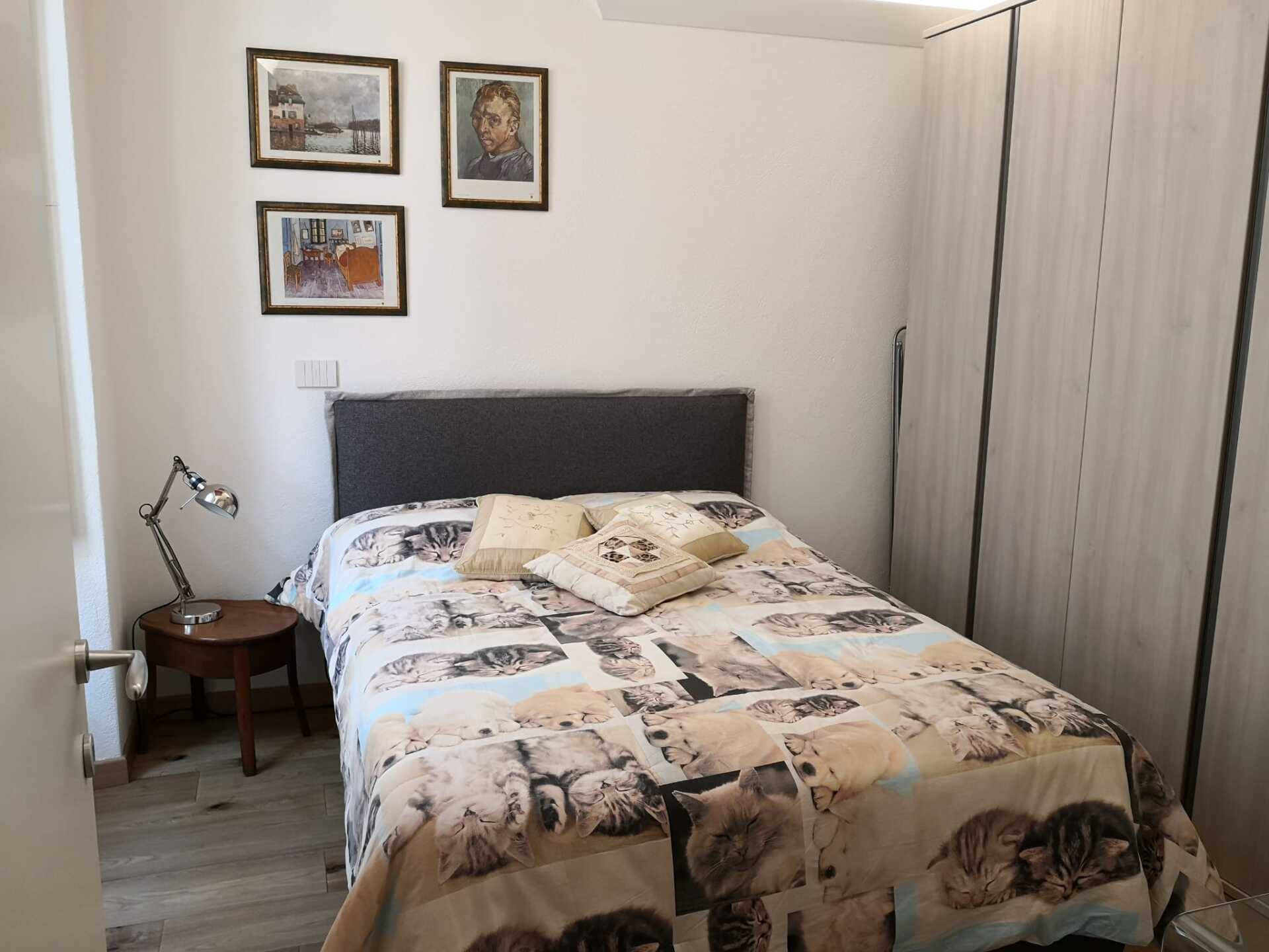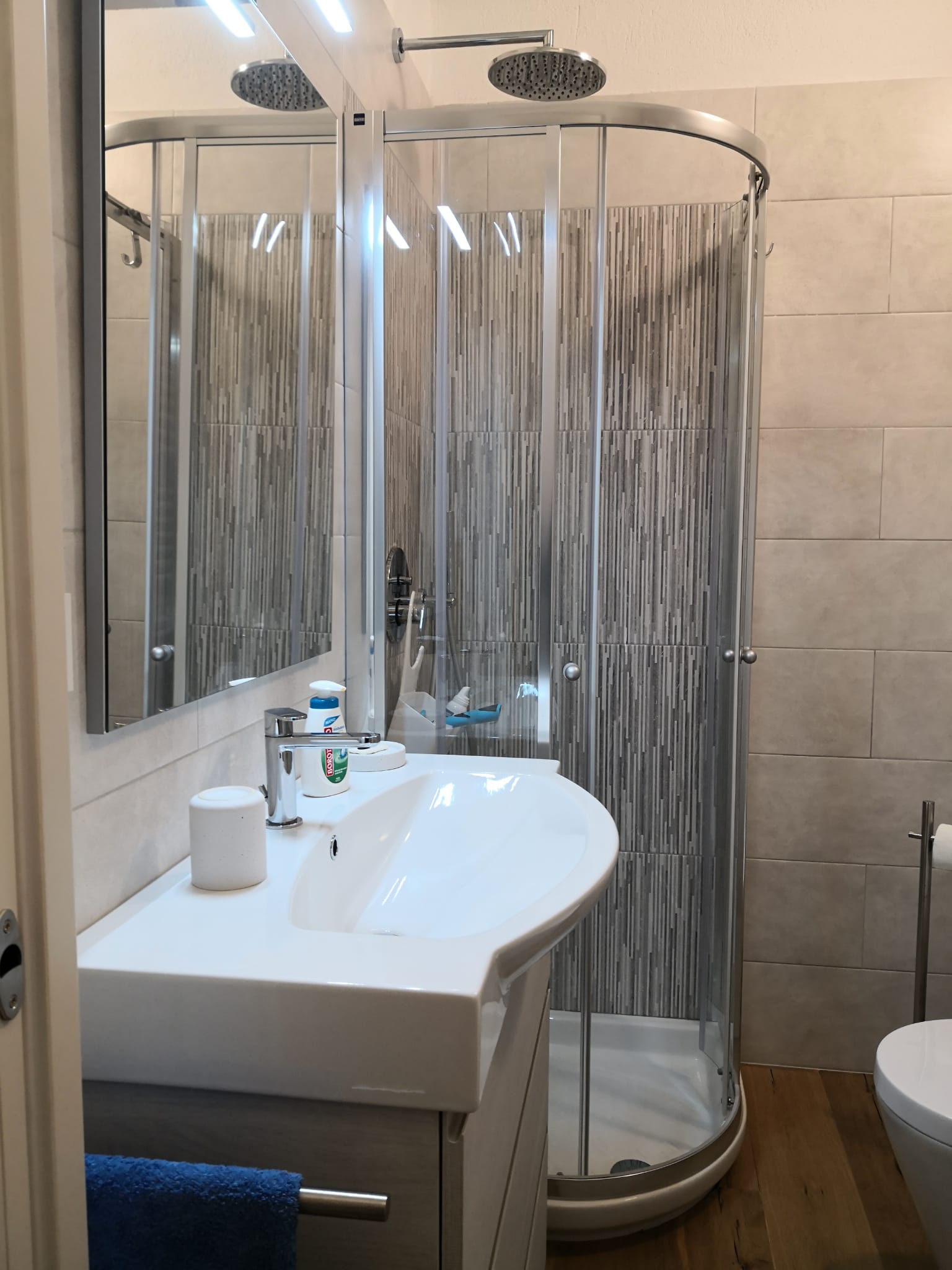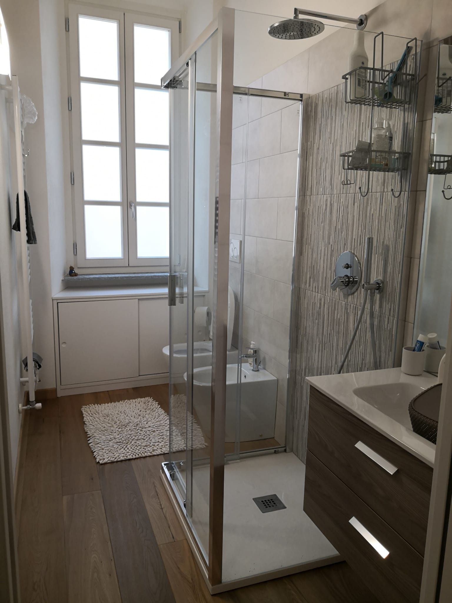 La seconda camera da letto ha un grande armadio ad ante, un tavolino di design in vetro, un arredobagno d'epoca riadattato a tavolino da notte. Letto alla francese con una piazza e mezza. Bagno bello e spazioso, con doccia ad angolo, wc e bidet.