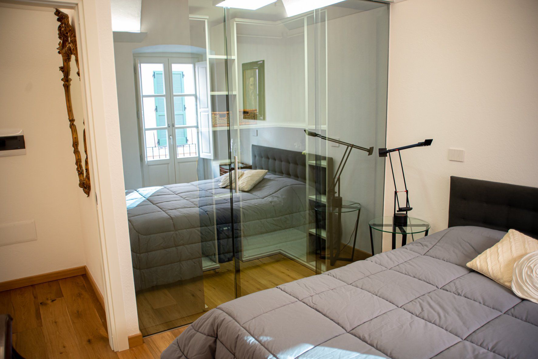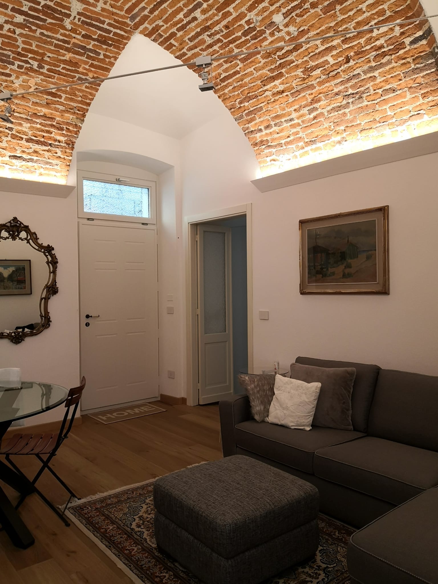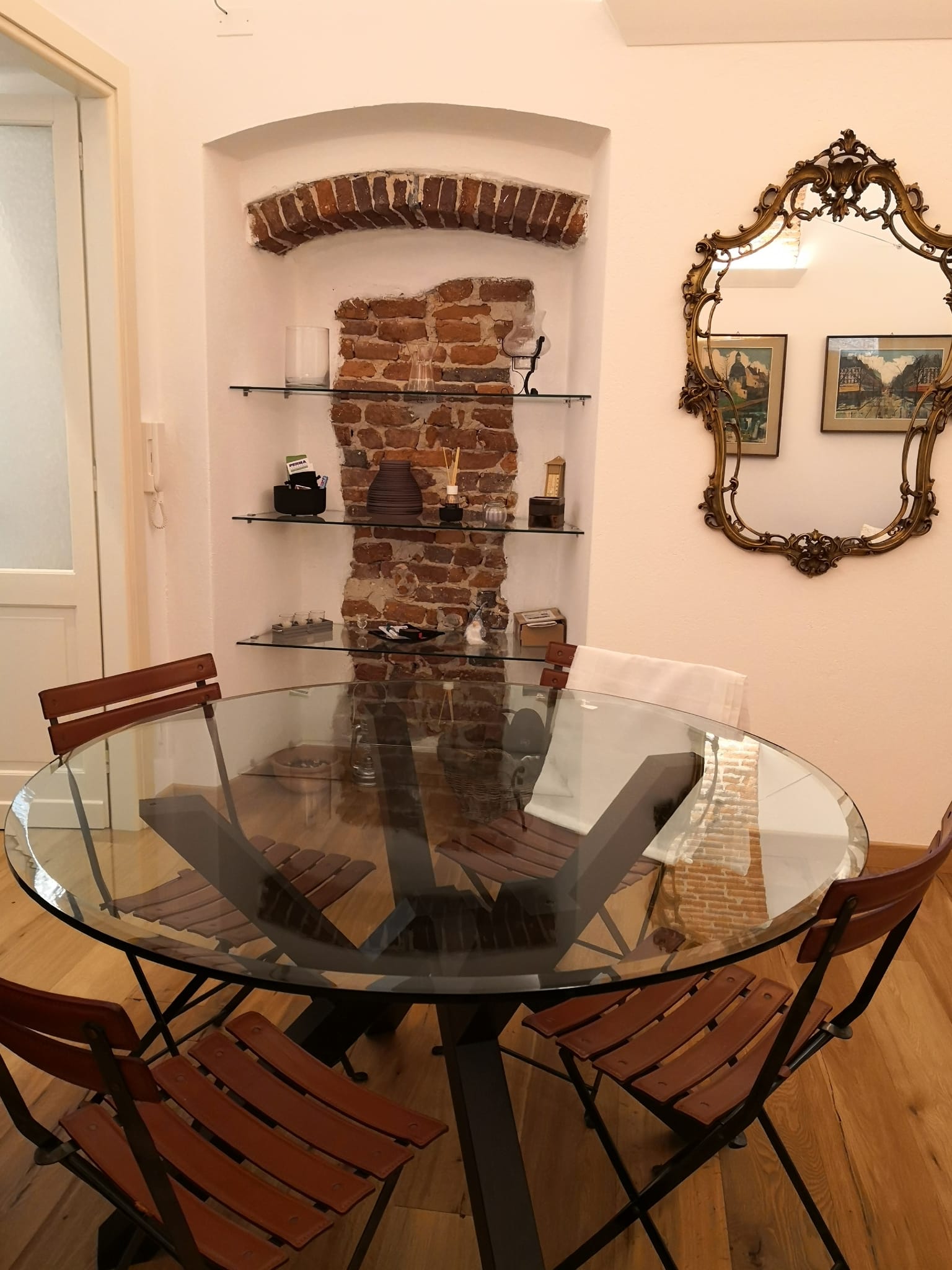 We are located in the heart of the historic center of Cuneo, in the street that takes the name of Count Carlo Massimiliano Roero, husband of the famous Rosa Ignazia Diodata Saluzzo, an appreciated poetess of the early 1800s. The entire building was owned by the Count and had the classic construction form of the time, with a central courtyard with warehouses and stables on the ground floor and manor lodgings on the first floor. Our apartment overlooks Via Carlo Manfredi di Luserna and is very bright compared to the standard of the old part of the city. The careful and meticulous renovation has brought a prestigious and noble air back to the environment, enhancing the cross ceilings with cut bricks, which testify to the availability of wealth of the family. The wooden floors and the details of the original interior doors and the niches obtained give warmth and personality In the apartment you will find a beautiful kitchen with all the necessary appliances, a large fridge with freezer, a traditional oven, a microwave, a 4-burner hob and a dishwasher with a generous worktop. A practical shelf with nice stools for a quick breakfast or snack. The majestic living room welcomes you with a large glass dining table, a generously sized L-shaped sofa to pass the time chatting or watching the big TV. A glass door allows the passage to the small but beautiful balcony on the street. The master bedroom, furnished as a suite, has a beautiful walk-in closet with mirrored glass and friction sliding door, 2 bedside tables and a period desk. The large and comfortable double bed. Here too we find a small but lovely balcony. In the large bathroom there is space for the shower, the toilet and the bidet and a window to give brightness and air to the environment. The second bedroom has a large wardrobe with doors, a design glass table, a vintage bathroom furniture adapted to a night table. French bed with a square and a half. Nice and spacious bathroom, with corner shower, toilet and bidet. The peculiarity lies in the walls that are not full height, but end with glass on the ceiling, to give a feeling of greater space to the rooms and natural light. At 100 meters we find Via Roma and Piazza Virginio where the Friday market and numerous events take place under the central roof. Also nearby is the complex of San Francesco and its museum.
