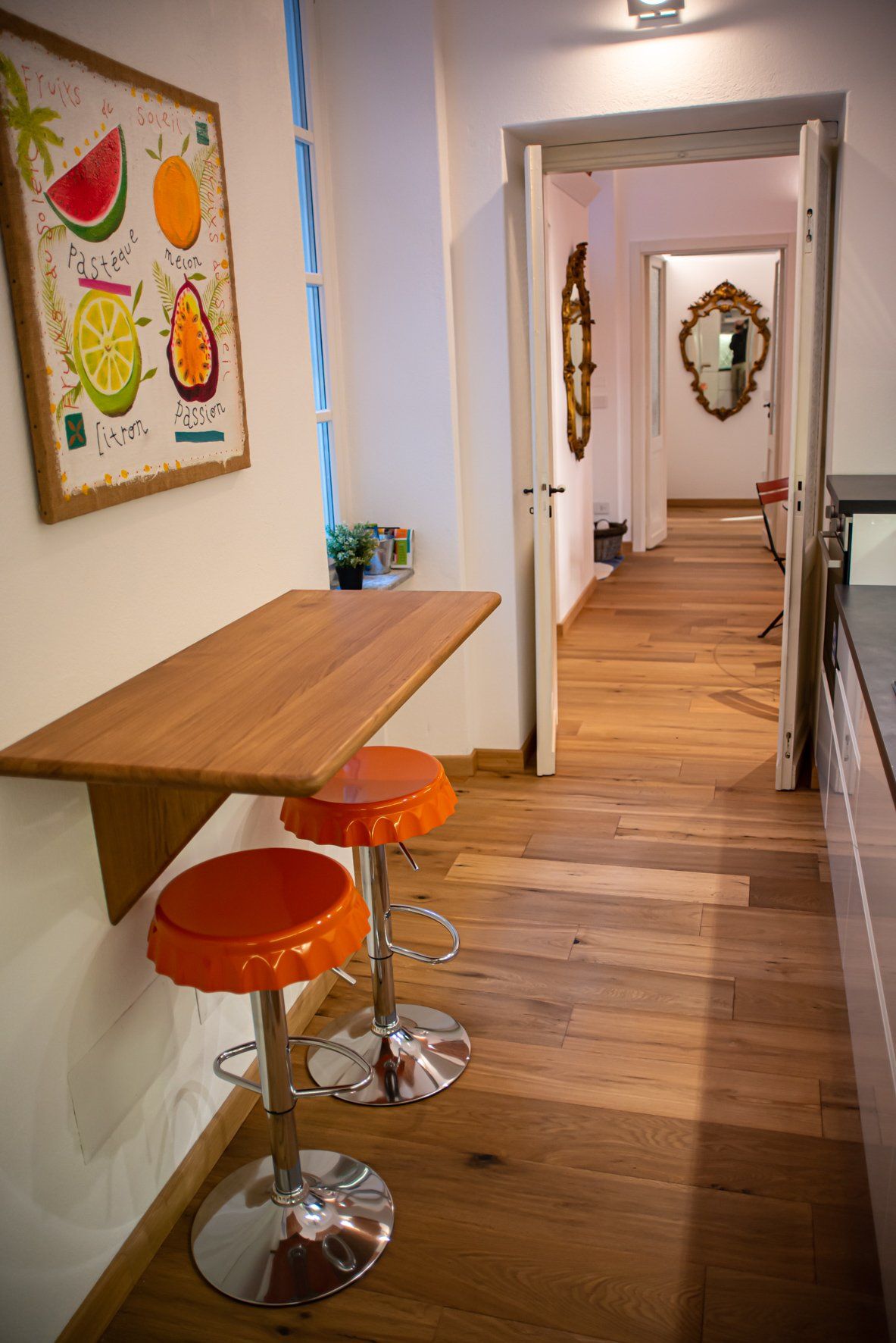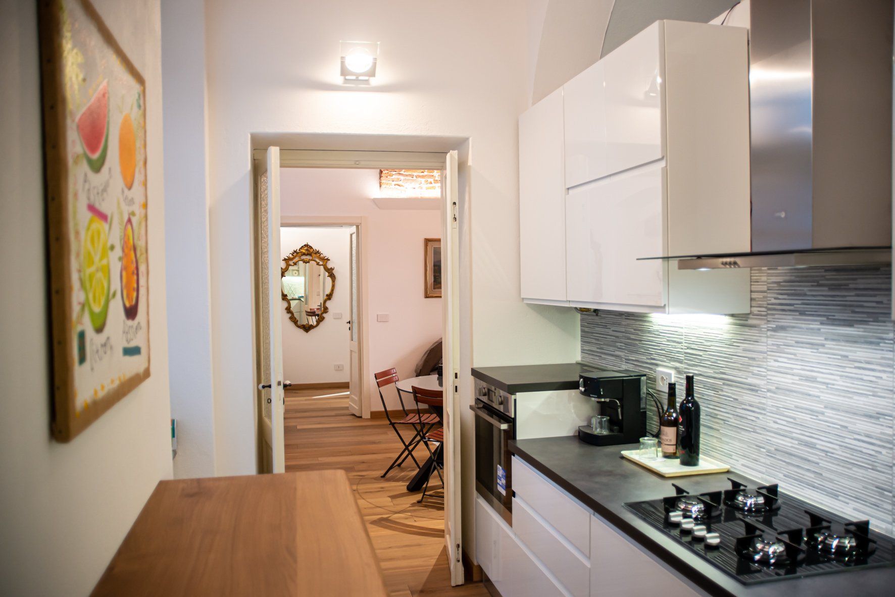 Loft in a magnificent frescoed dome from 1710. The apartment is the result of a restoration that has restored the octagonal hall of 60 square meters to its splendor. You will stay under the gaze of the God Apollo, his Muses and curious cherubs. In the one environment a comfortable sofa, a dining table, a bed with a wardrobe to breathe the air of the past. Imagine the story that these walls have seen in the past. Complete a kitchen, a bathroom recovered under the arched brick vaults. The building is known as Palazzo Rubatti di Torricella or Palazzo Tornaforte. Built in the mid-seventeenth century, the architect of the work is Francesco Gallo, author of over 80 buildings in southern Piedmont including the Sanctuary of Vicoforte "Magnificat". The original owners, the Rubatti, are an ancient decurional family of the Cuneo stalls, present in the list of 1535 with a noble chapel in San Francesco. The Count Carlo Massimiliano and his wife, the noble Violante Maria De Morri, daughter of the Counts De Morri of Castelmagno, live here. Subsequently the noble Barbara Violante Rubatti and her husband Marquis Della Valle Di Clavesana. And finally (just to name a few) the noble Paola Felicita Della Valle and her husband, the famous Count Saverio Bruno di Tornaforte, a heroic militia general. Here in 1809 Pope Pius VII visited the old Count of Tornefort during his journey, prisoner of Napoleon. In short, this show has seen 350 years of history, illustrious characters and magnificent parties. It is precisely the concert of the Muses, a theme chosen by the Rubatti to decorate the vault of the hall of honor, to suggest its use. In 1710 the Swiss painter Giovan Francesco Gaggini, who was working at the Church of the Holy Cross in Cuneo together with the Pozzi brothers, authors of the paintings, was called to perform the work. Clio, Euterpe, Thalia, Melpomene, Tersicore, Erato, Polimnia, Urania and Calliope, accompanied by a correspondence of putti, observe the God Apollo, isolated in the center of the composition, wrapped in a large drapery, crowned with laurel, while with one hand greets and with the other holds the lyre. The scene announces the beginning of an imminent concert: the muses and the putti are ready to play and sing, the instruments tuned, the scores open, while Apollo, conductor of the orchestra, with the gesture of the arm will give the start. The scene is set in the sky, between vaporous white-blue-yellowish-pink clouds. A rich shaped balustrade surrounds the opening towards the sky, highlighting the illusory breaking of the ceiling, while the scenographic painted architectural structure continues below with ample volutes, fake marbles and oval windows, vases full of fruits, garlands, festoons and branches foliaceous. In the living room you can see an original painting restored (oil on canvas) of the heraldic coat of arms of the Rubatti-De Morri alliance. The occasion is precisely the marriage that was celebrated in the Parish Church of Santa Maria del Bosco, Cathedral of Cuneo, on 3 February 1694, with the motto Tas Stil. The saloon was recovered and brought as much as possible to the original of the time. In the center, a fifth contains a walk-in closet and shelters the double bed. A sofa bed, a glass table with chairs and an open bookcase complete the deliberately minimalist furniture. In other spaces you will find a fully equipped kitchen with fridge, induction hob, dishwasher, "Nespresso" coffee machine. In a small storage room also a comfortable washing machine. Bathroom with shower, toilet and comfortable vertical heated towel rail. La Cupola is located on the third floor of the building, without a lift. The stairs are very large and accessible.