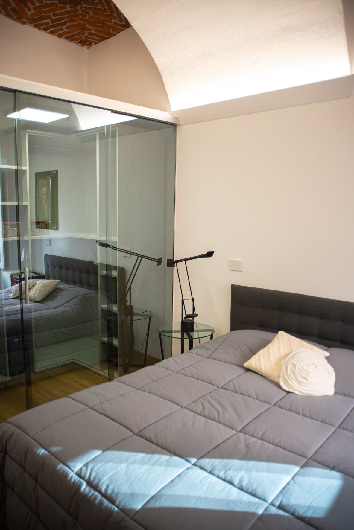 Loft in una magnifica cupola affrescata del 1710. L'appartamento è il risultato di un'opera di restauro che ha riportato al suo splendore il salone ottagonale di 60 mq. Soggiornerete sotto lo sguardo del Dio Apollo, le sue Muse e curiosi putti. Nell'unico ambiente un comodo divano, un tavolo pranzo, un letto con cabina armadio per respirare l'aria del passato. Immaginare la storia che questi muri hanno visto passare. Completano una cucina, un bagno recuperati sotto le volte ad arco di mattoni. L'immobile è conosciuto come Palazzo Rubatti di Torricella o Palazzo Tornaforte. Costruito nella metà del XVII secolo, l'architetto dell'opera è Francesco Gallo, autore di oltre 80 edifici nel Piemonte meridionale tra cui il Santuario di Vicoforte "Magnificat". I proprietari originali, i Rubatti, sono un'antica famiglia decurionale de platea di Cuneo, presente nell'elenco del 1535 con cappella gentilizia in San Francesco. In questo Palazzo trovano dimora Il Conte Carlo Massimiliano e la sua sposa la nobile Violante Maria De Morri, figlia dei Conti De Morri di Castelmagno. Successivamente la nobile Barbara Violante Rubatti e il marito Marchese Della Valle Di Clavesana. Ed infine (solo per citarne alcuni) la nobile Paola Felicita Della Valle ed il marito, il famoso Conte Saverio Bruno di Tornaforte, eroico Generale di milizia. Qui nel 1809 il Papa Pio VII fa visita al vecchio Conte di Tornefort durante il suo viaggio, prigioniero di Napoleone. Insomma questo salone ha visto 350 anni di storia, personaggi illustri e magnifiche feste. E' proprio il concerto delle Muse, tema scelto dai Rubatti per decorare la volta del salone d'onore, a suggerirne l'uso. Nel 1710 fu chiamato ad eseguire l'opera il pittore svizzero Giovan Francesco Gaggini, che stava lavorando alla Chiesa della Santa Croce a Cuneo insieme ai fratelli Pozzi, autori delle quadrature. Clio, Euterpe, Thalia, Melpomene, Tersicore, Erato, Polimnia, Urania e Calliope, accompagnate da un carteggio di putti, osservano il Dio Apollo, isolato al centro della composizione, avvolto in un ampio panneggio, coronato di alloro, mentre con una mano saluta e con l'altra tiene la lira. La scena annuncia l'inizio di un imminente concerto: le muse ed i putti sono pronti a suonare e cantare, gli strumenti accordati, gli spartiti aperti, mentre Apollo, direttore di orchestra, col gesto del braccio ne darà il via. La scena è ambientata in cielo, tra vaporose nubi bianco-azzurrine-gialline-rosate. Una ricca balaustra sagomata contorna l'apertura verso il cielo, mettendone in risalto l'illusivo sfondamento del soffitto, mentre lo scenografico apparato architettonico dipinto prosegue inferiormente con ampie volute, finti marmi e finestre ovali, vasi colmi di frutti, ghirlande, festoni e tralci fogliacei. Nel salone potrete osservare un dipinto originale restaurato (olio su tela) dello stemma araldico dell'arma di alleanza Rubatti-De Morri. L'occasione è appunto il matrimonio che fu celebrato nella Chiesa Parrocchiale di Santa Maria del Bosco, Duomo di Cuneo, il 3 febbraio 1694, con il motto Tas Stil. Il salone è stato recuperato e portato il più possibile all' originale dell'epoca. In centro, una quinta contiene una cabina armadio e dà riparo al letto matrimoniale. Un divano letto, un tavolo in cristallo con sedie ed una libreria a giorno completano l'arredamento volutamente minimalista. In altri spazi troverete una cucina completamente attrezzata con frigorifero, piano cottura ad induzione, lavastoviglie, macchinetta caffè "Nespresso". In un piccolo ripostiglio anche una comoda lavatrice. Bagno con doccia, wc e comodo termoarredo verticale. La Cupola si trova al terzo piano dell'edificio, senza ascensore. Le scale sono molto ampie ed accessibili.