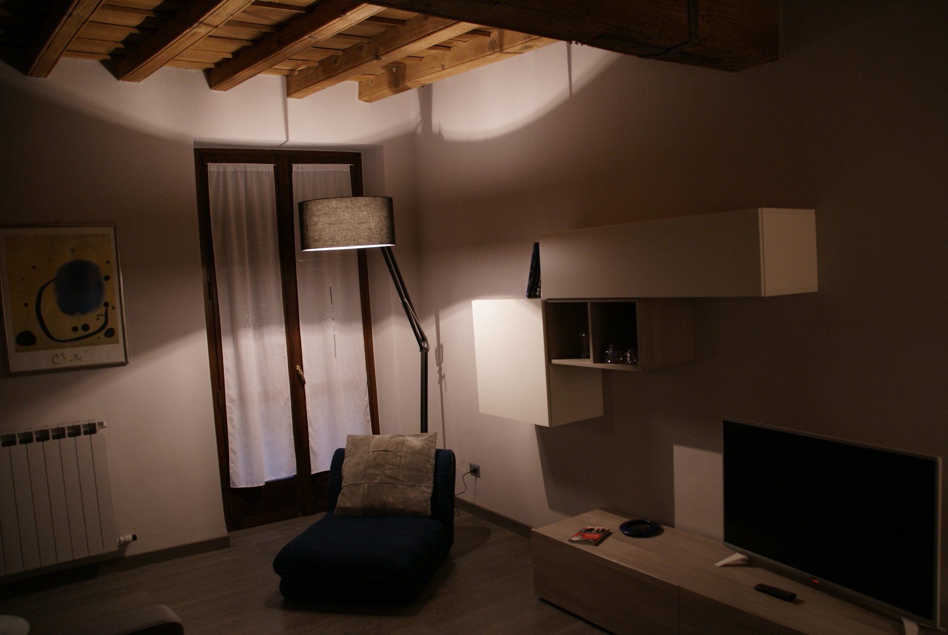 Completely renovated, the accommodation has an entrance, a living area with a large double sofa bed and a relaxing armchair that turns into a single bed. The floor is new in solid wood and the ceiling is antique with oak beams and strips and original birch panels, completely cleaned and restored to their natural color. 3-door and weekly wardrobe are new. A French window opens onto the balcony overlooking the street. The light is warm and suitable for a comfortable and relaxing environment. The kitchen has a barrel vault and is equipped with a new glass table with upholstered chairs. Gas hob and electric hotplate, fridge, plates, glasses, cutlery, pots and generally everything you need for cooking. A large window makes it light and airy. The bathroom is new, with original wooden ceiling, shower, toilet, sink and a washing machine. Autonomous and automatic heating. Unlimited free WIFI.