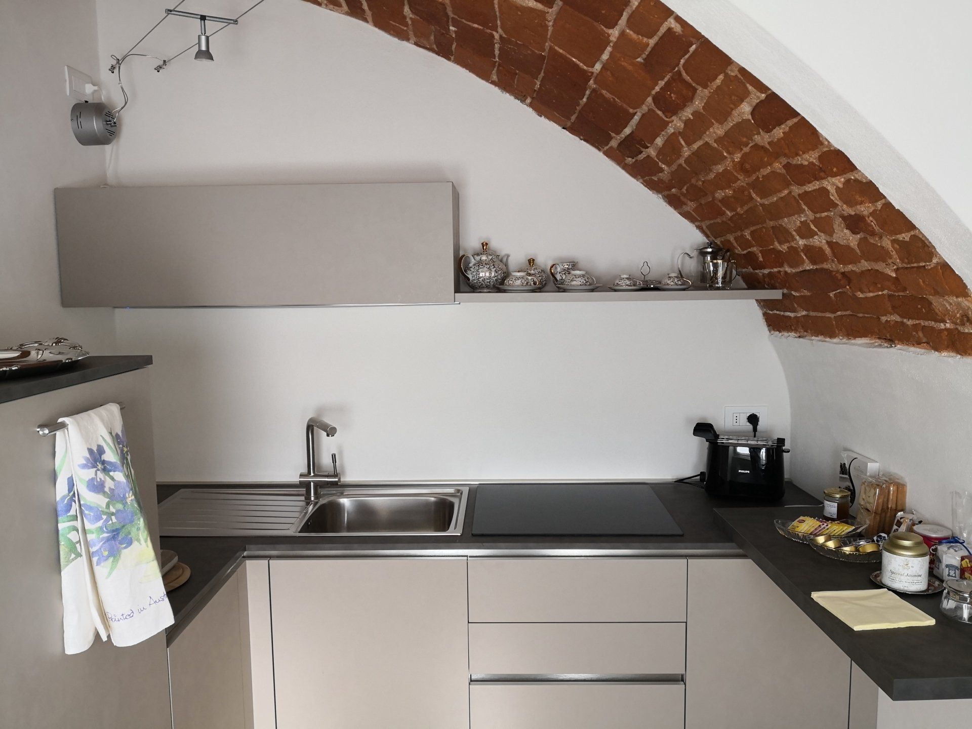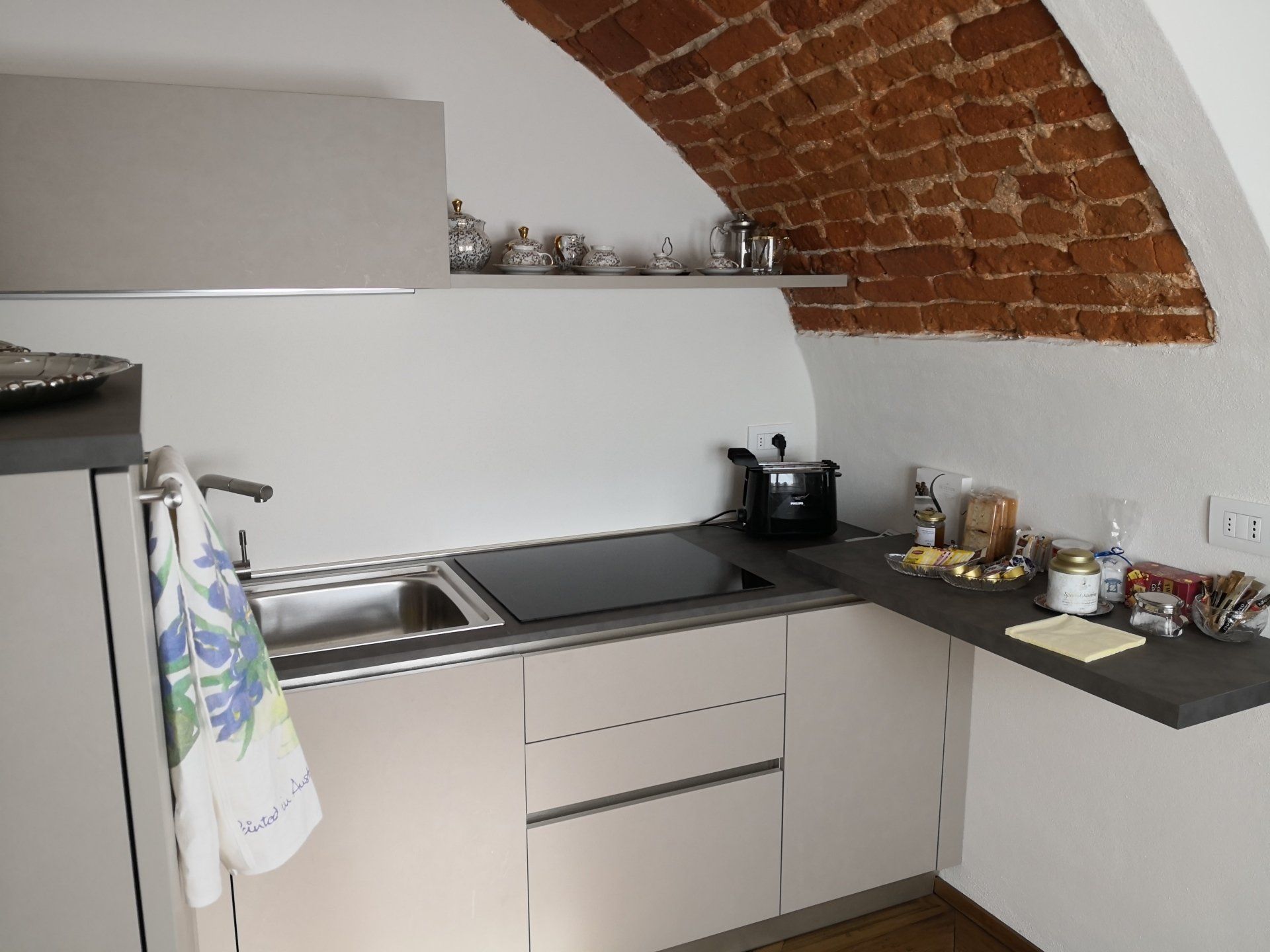 Loft in a magnificent frescoed dome from 1710. The apartment is the result of a restoration that has restored the octagonal hall of 60 square meters to its splendor. You will stay under the gaze of the God Apollo, his Muses and curious cherubs. In the one environment a comfortable sofa, a dining table, a bed with a wardrobe to breathe the air of the past. Imagine the story that these walls have seen in the past. Complete a kitchen, a bathroom recovered under the arched brick vaults. The building is known as Palazzo Rubatti di Torricella or Palazzo Tornaforte. Built in the mid-seventeenth century, the architect of the work is Francesco Gallo, author of over 80 buildings in southern Piedmont including the Sanctuary of Vicoforte "Magnificat". The original owners, the Rubatti, are an ancient decurional family of the Cuneo stalls, present in the list of 1535 with a noble chapel in San Francesco. The Count Carlo Massimiliano and his wife, the noble Violante Maria De Morri, daughter of the Counts De Morri of Castelmagno, live here. Subsequently the noble Barbara Violante Rubatti and her husband Marquis Della Valle Di Clavesana. And finally (just to name a few) the noble Paola Felicita Della Valle and her husband, the famous Count Saverio Bruno di Tornaforte, a heroic militia general. Here in 1809 Pope Pius VII visited the old Count of Tornefort during his journey, prisoner of Napoleon. In short, this show has seen 350 years of history, illustrious characters and magnificent parties. It is precisely the concert of the Muses, a theme chosen by the Rubatti to decorate the vault of the hall of honor, to suggest its use. In 1710 the Swiss painter Giovan Francesco Gaggini, who was working at the Church of the Holy Cross in Cuneo together with the Pozzi brothers, authors of the paintings, was called to perform the work. Clio, Euterpe, Thalia, Melpomene, Tersicore, Erato, Polimnia, Urania and Calliope, accompanied by a correspondence of putti, observe the God Apollo, isolated in the center of the composition, wrapped in a large drapery, crowned with laurel, while with one hand greets and with the other holds the lyre. The scene announces the beginning of an imminent concert: the muses and the putti are ready to play and sing, the instruments tuned, the scores open, while Apollo, conductor of the orchestra, with the gesture of the arm will give the start. The scene is set in the sky, between vaporous white-blue-yellowish-pink clouds. A rich shaped balustrade surrounds the opening towards the sky, highlighting the illusory breaking of the ceiling, while the scenographic painted architectural structure continues below with ample volutes, fake marbles and oval windows, vases full of fruits, garlands, festoons and branches foliaceous. In the living room you can see an original painting restored (oil on canvas) of the heraldic coat of arms of the Rubatti-De Morri alliance. The occasion is precisely the marriage that was celebrated in the Parish Church of Santa Maria del Bosco, Cathedral of Cuneo, on 3 February 1694, with the motto Tas Stil. The saloon was recovered and brought as much as possible to the original of the time. In the center, a fifth contains a walk-in closet and shelters the double bed. A sofa bed, a glass table with chairs and an open bookcase complete the deliberately minimalist furniture. In other spaces you will find a fully equipped kitchen with fridge, induction hob, dishwasher, "Nespresso" coffee machine. In a small storage room also a comfortable washing machine. Bathroom with shower, toilet and comfortable vertical heated towel rail. La Cupola is located on the third floor of the building, without a lift. The stairs are very large and accessible.