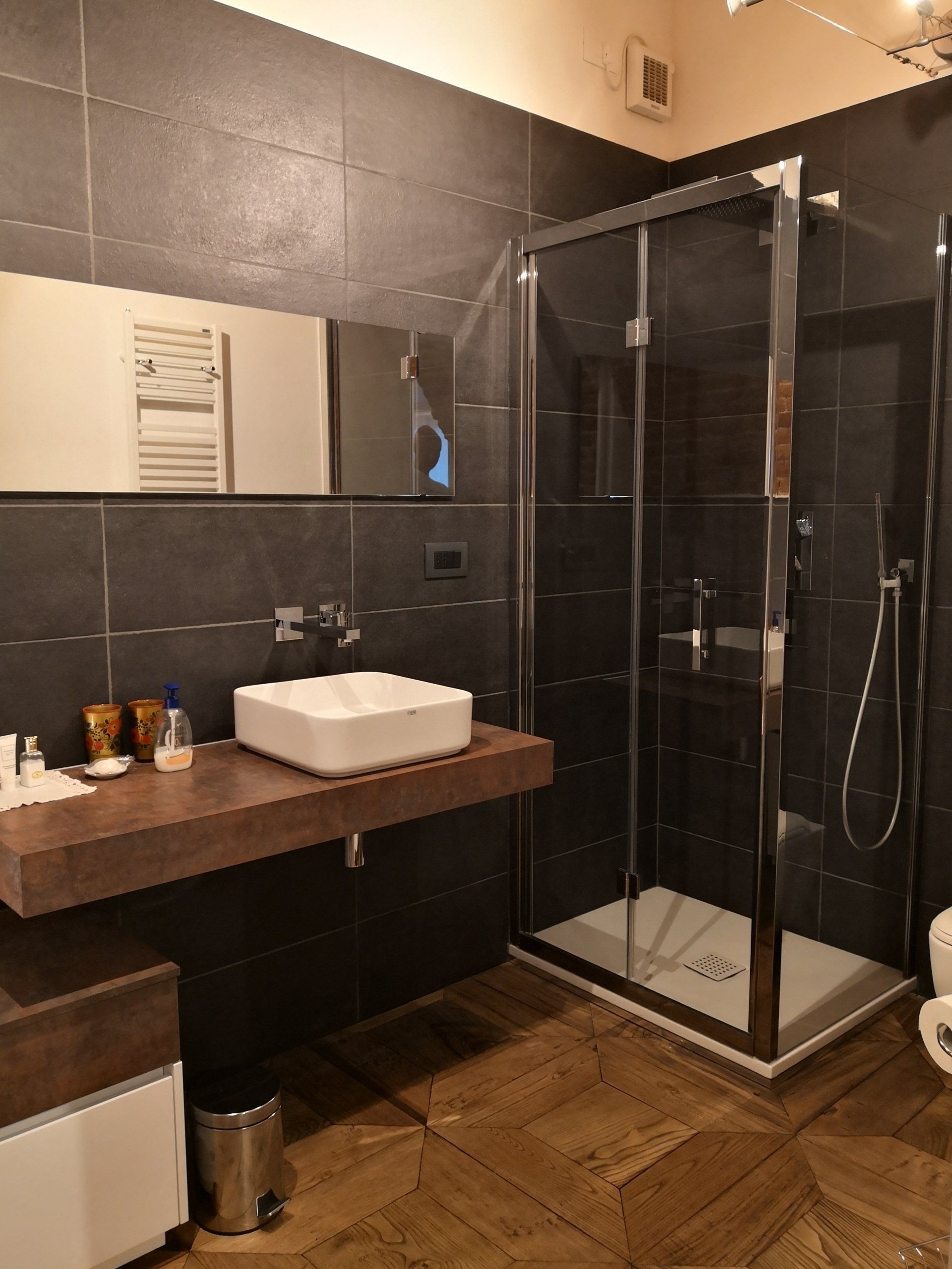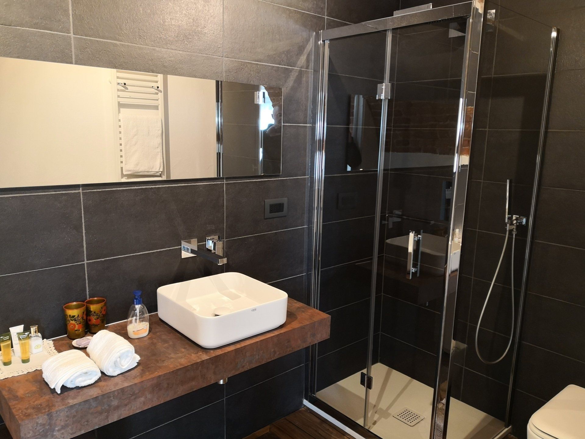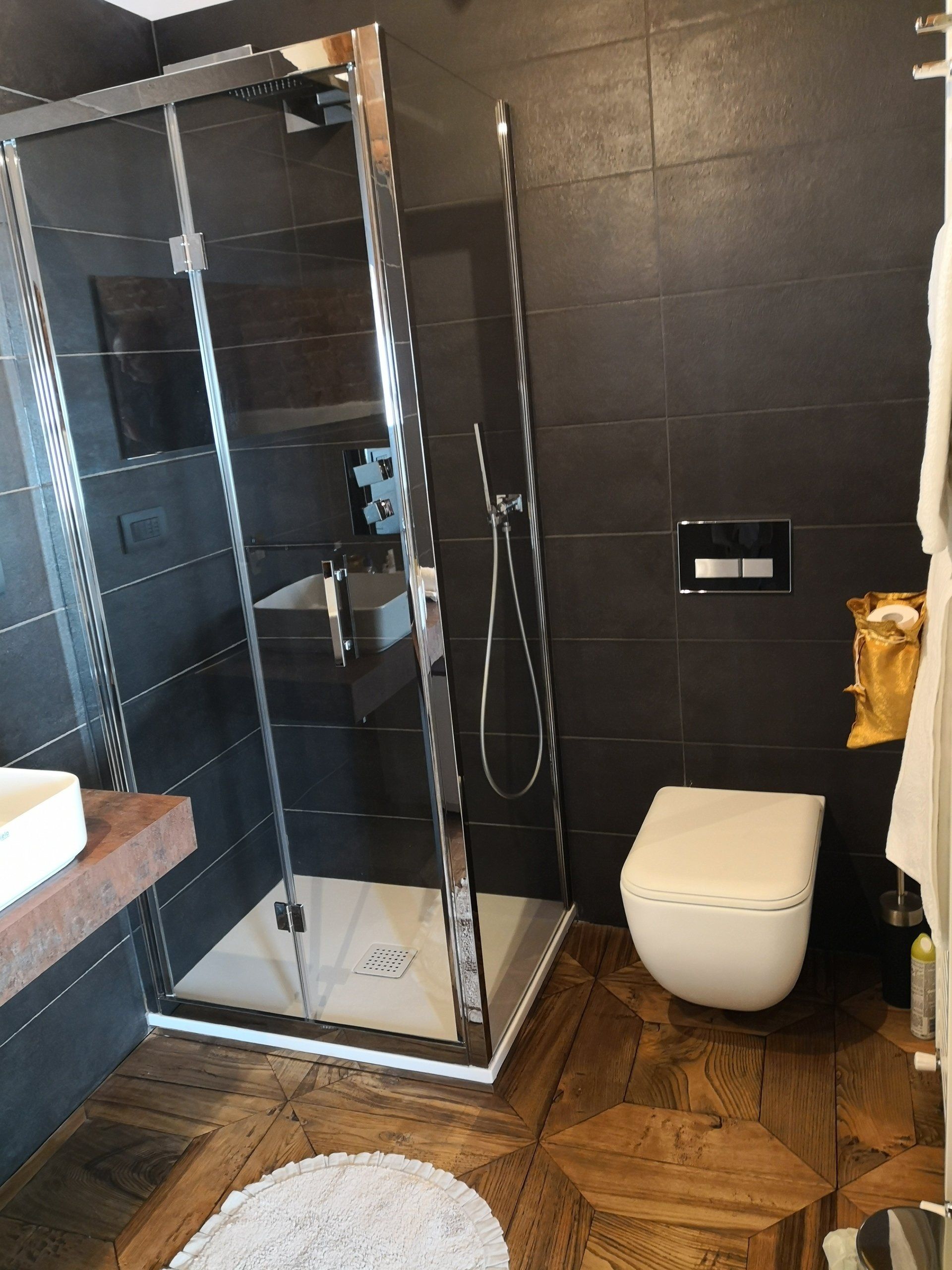Bagno con doccia, wc e comodo termoarredo verticale.