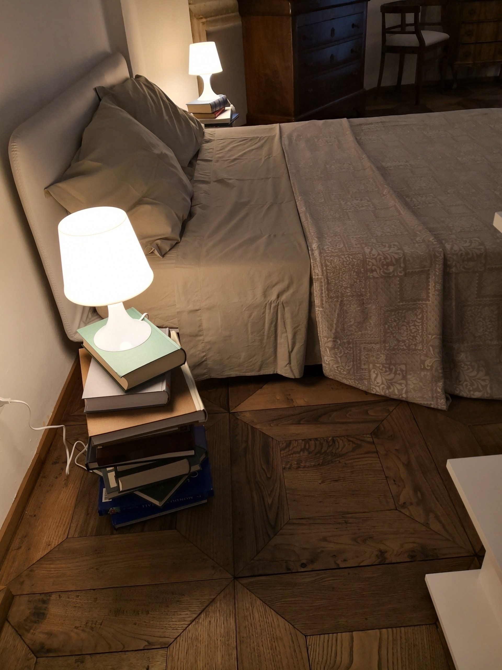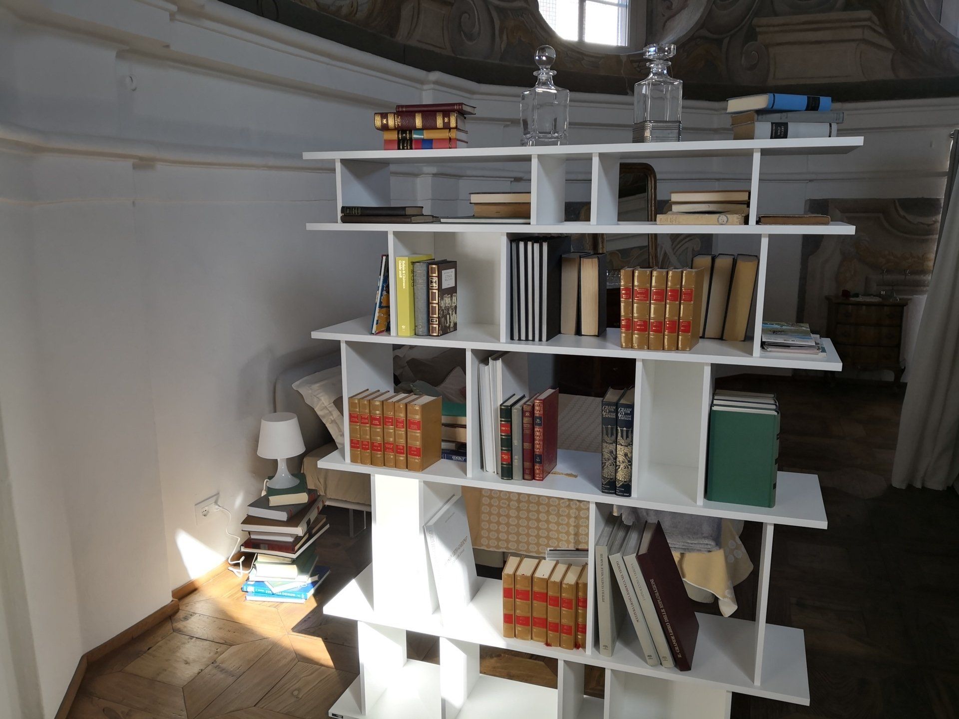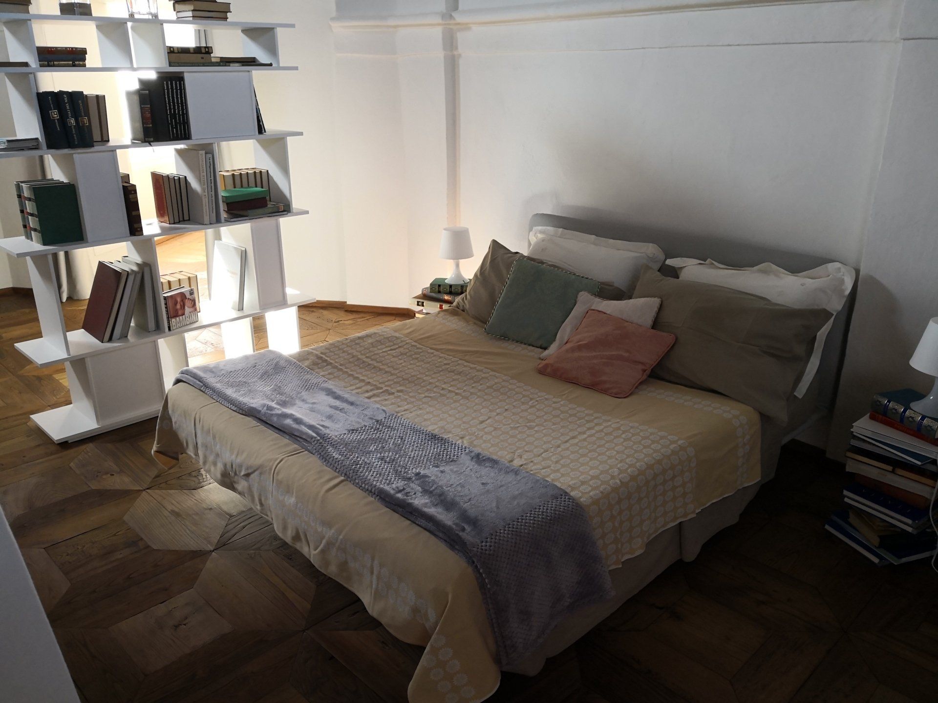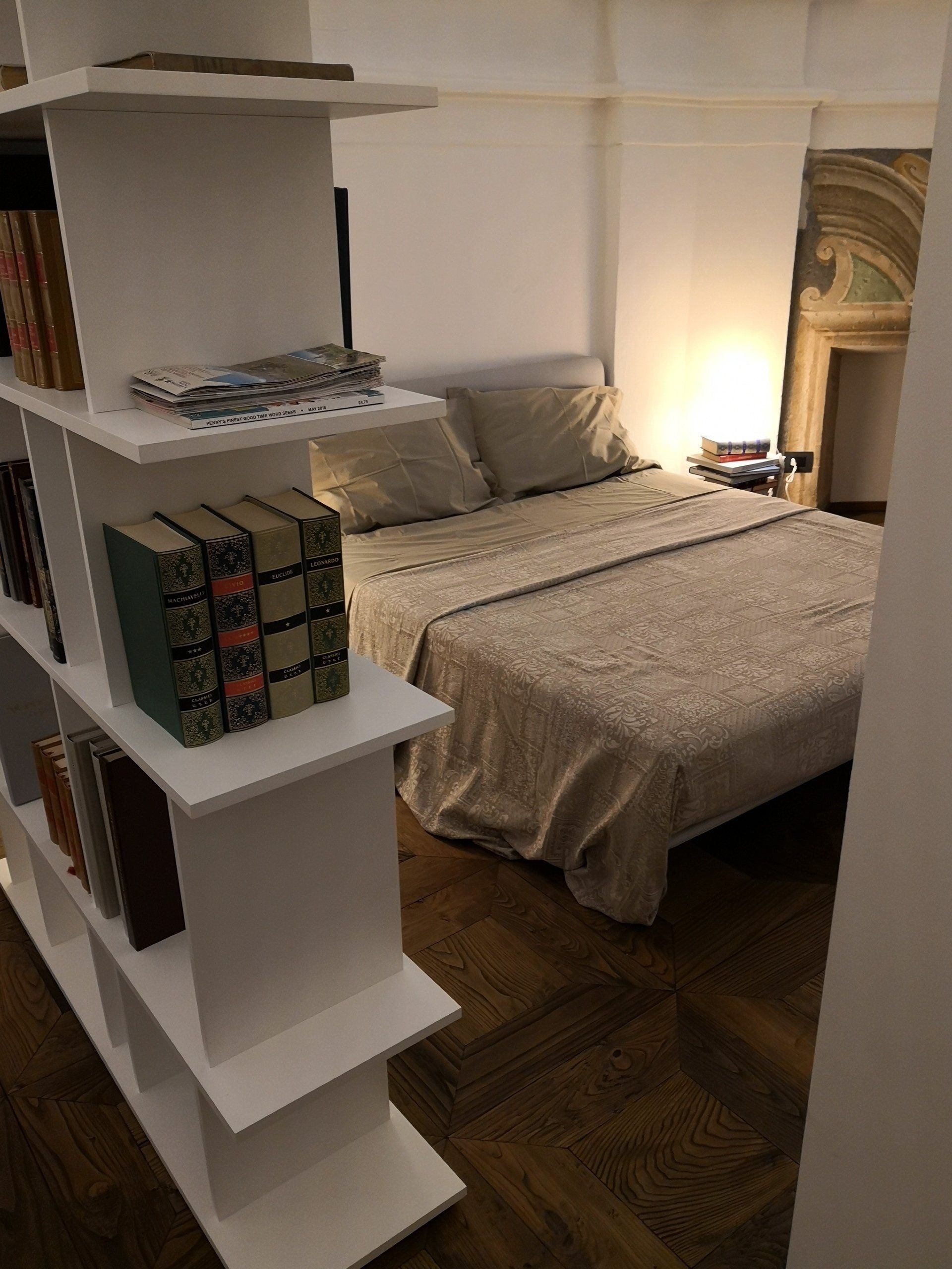 Il salone è stato recuperato e portato il più possibile all' originale dell'epoca. In centro, una quinta contiene una cabina armadio e dà riparo al letto matrimoniale.