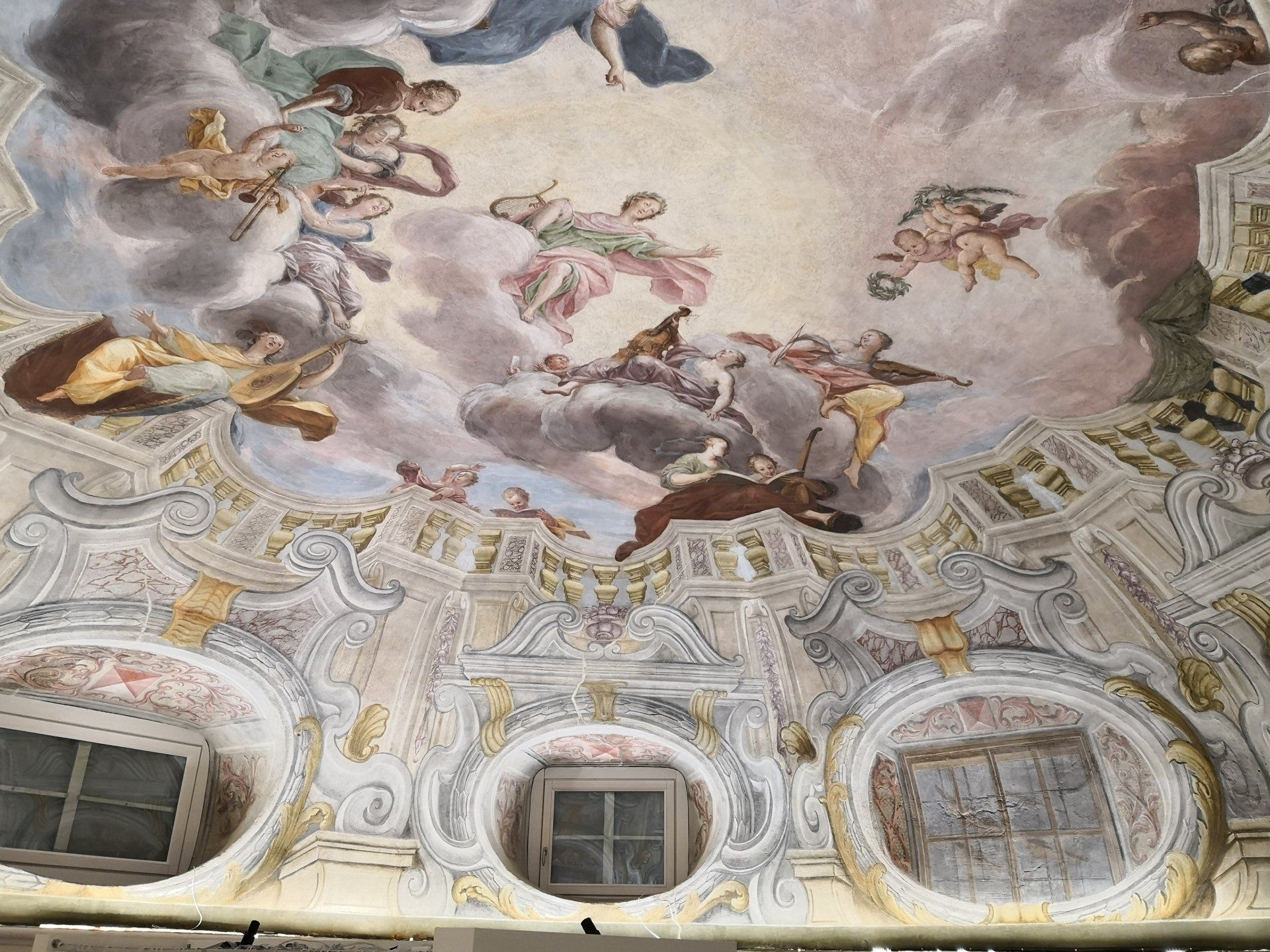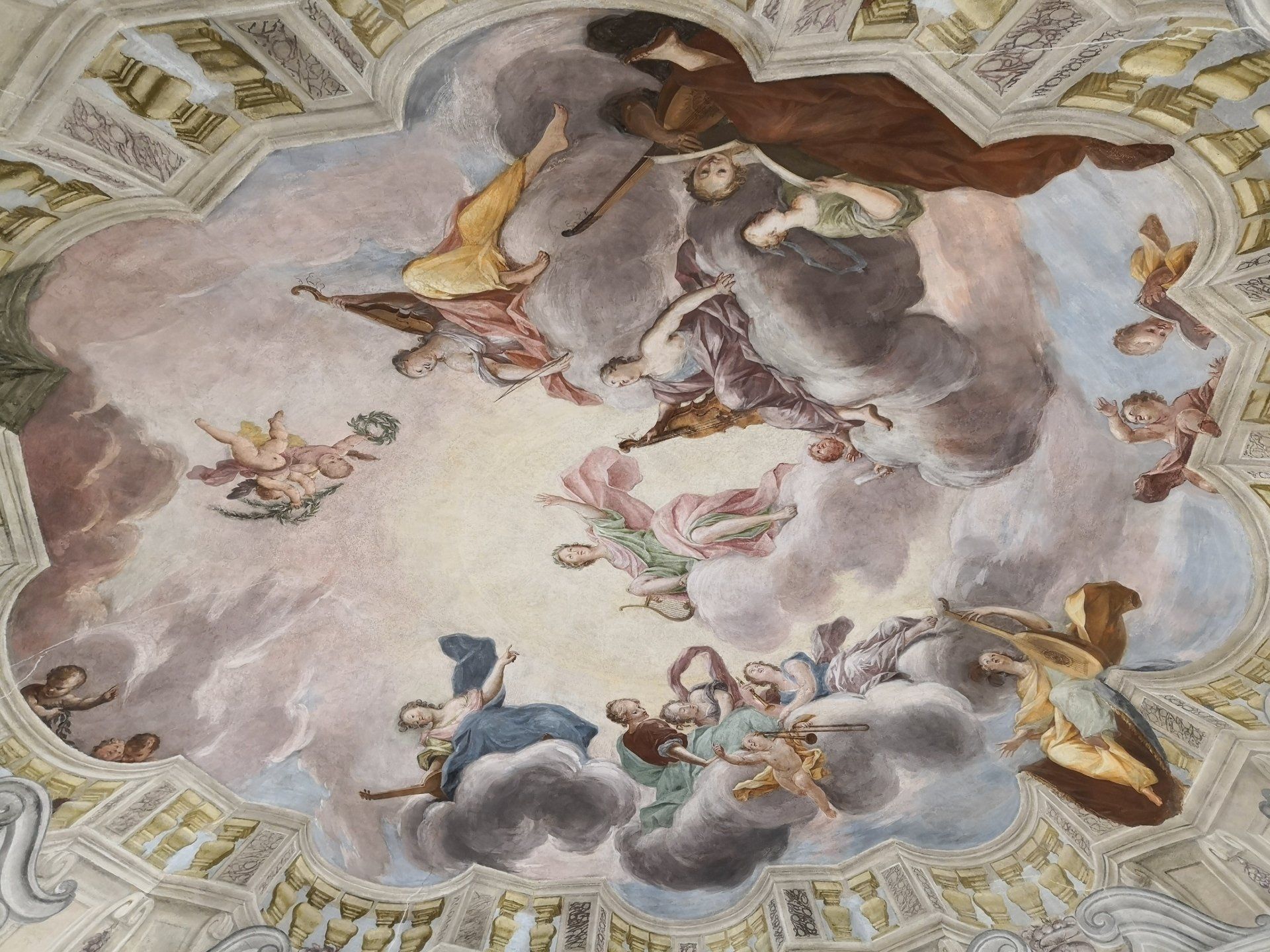 La scena annuncia l'inizio di un imminente concerto: le muse ed i putti sono pronti a suonare e cantare, gli strumenti accordati, gli spartiti aperti, mentre Apollo, direttore di orchestra, col gesto del braccio ne darà il via. La scena è ambientata in cielo, tra vaporose nubi bianco-azzurrine-gialline-rosate. Una ricca balaustra sagomata contorna l'apertura verso il cielo, mettendone in risalto l'illusivo sfondamento del soffitto, mentre lo scenografico apparato architettonico dipinto prosegue inferiormente con ampie volute, finti marmi e finestre ovali, vasi colmi di frutti, ghirlande, festoni e tralci fogliacei.